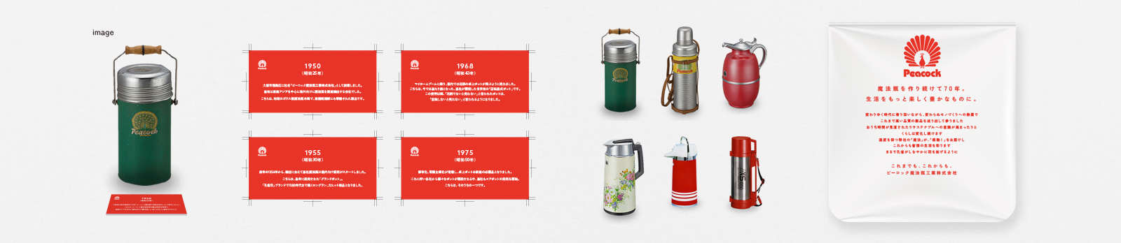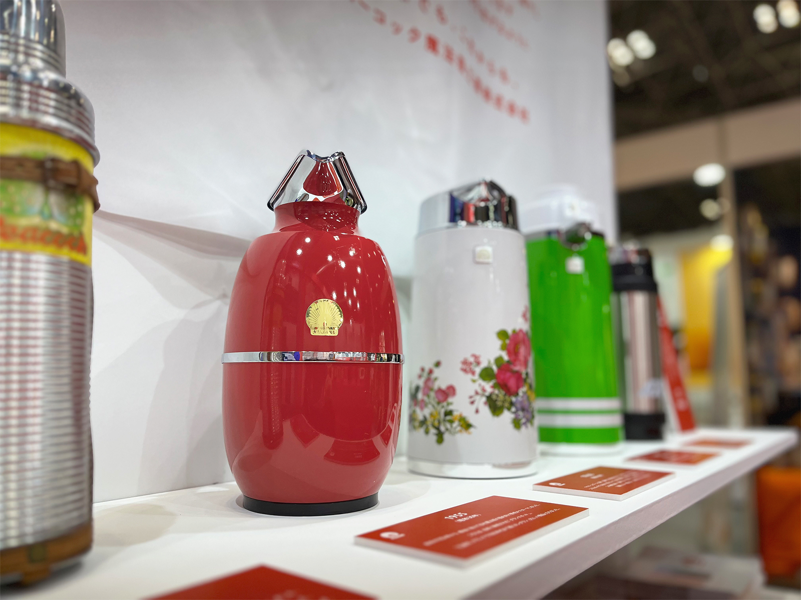 ピーコック魔法瓶工業様は1950年創業の老舗メーカーです。数ある魔法瓶メーカーの中で選ばれる存在となるために、同社の歴史や技術の蓄積を伝えるエリアも設けました。過去の商品展示とともにブランドの歩みを可視化することで、商品の背景にある信頼や開発力への理解を深める構成としています。