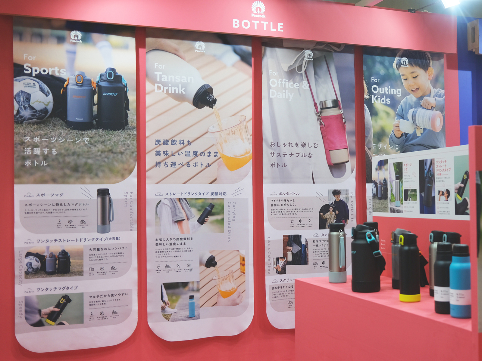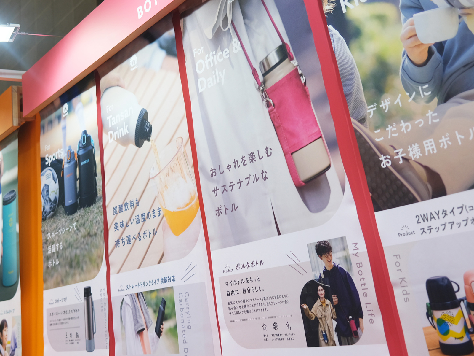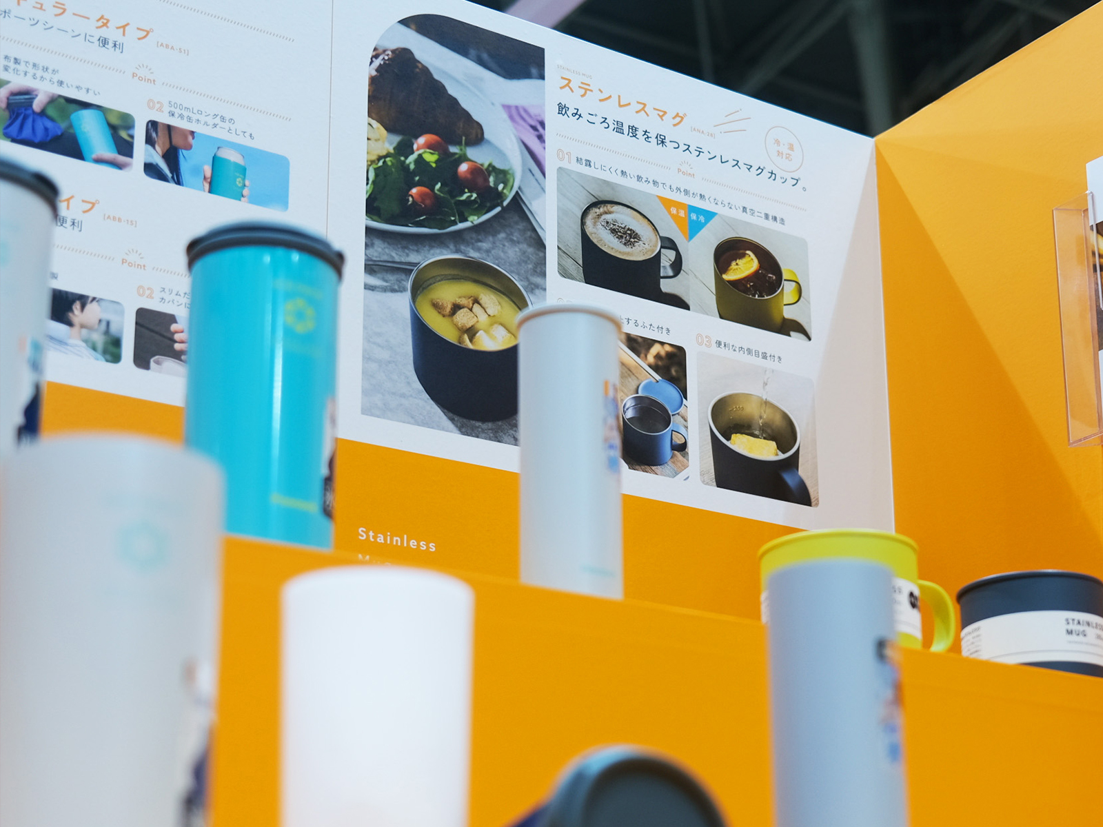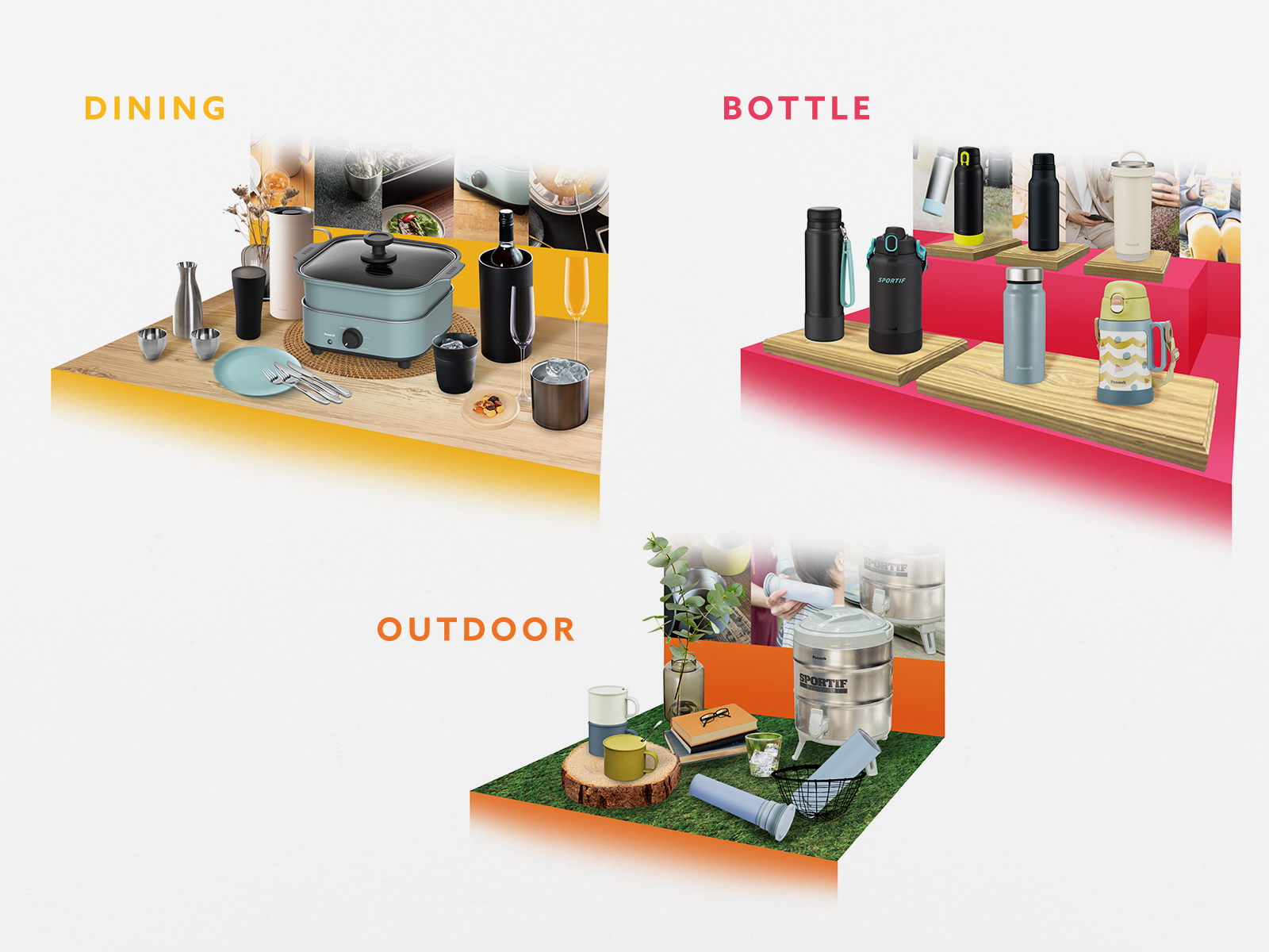 魔法瓶やボトルをはじめ、調理家電や酒器など幅広い商品を展開される同社にとって、今回が初出展。できる限り多くの商品を見せたいというご要望を受け、展示会という限られた空間の中で“伝わる整理”を行うことから設計をスタートしました。