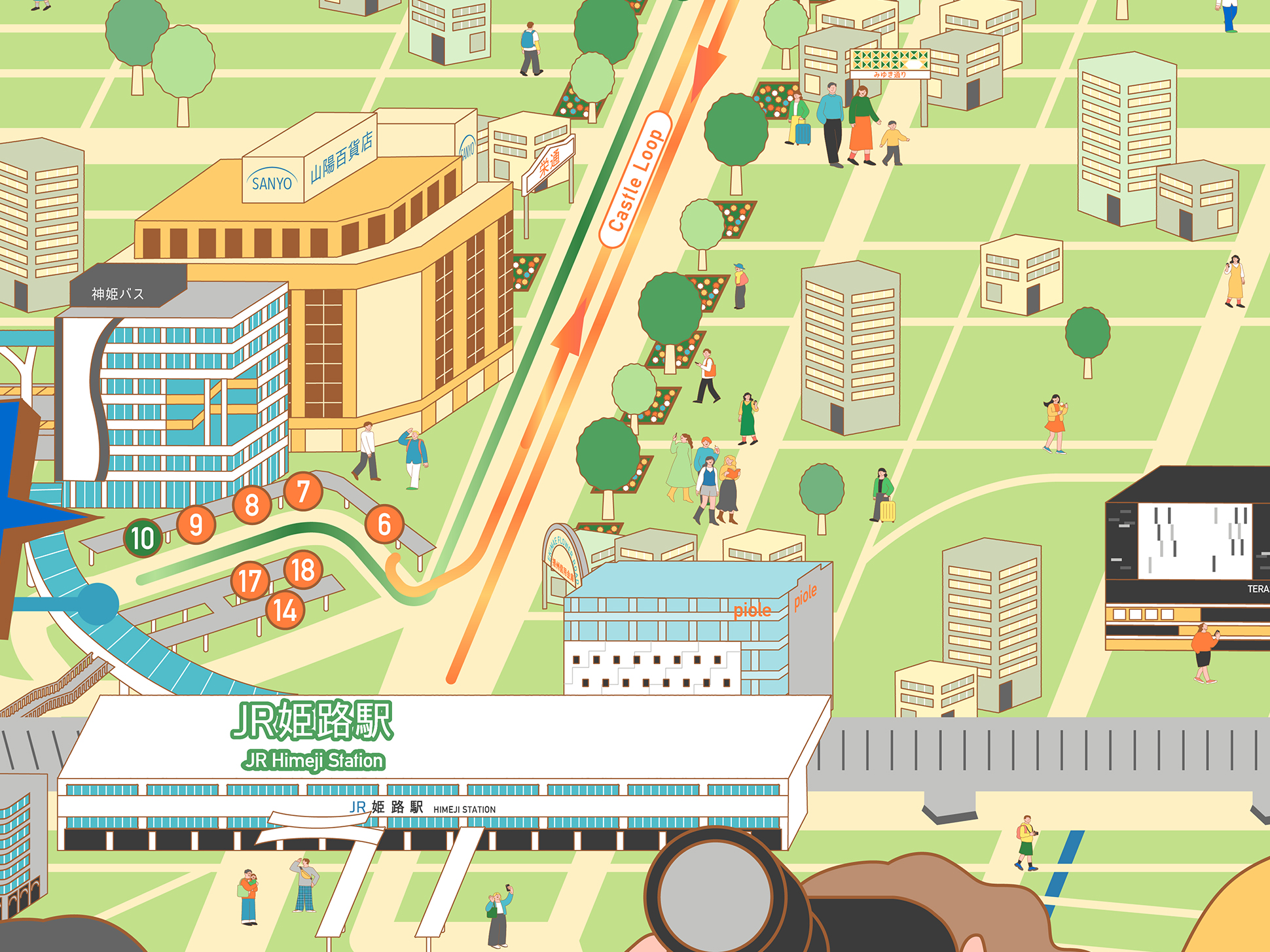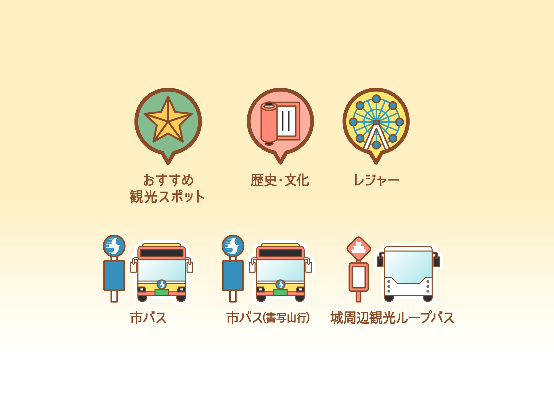 バスで巡る旅の楽しさや、街歩きの記憶に残る風景をイラストとして再構成し、地図そのものが“体験の一部”となることを意図しています。