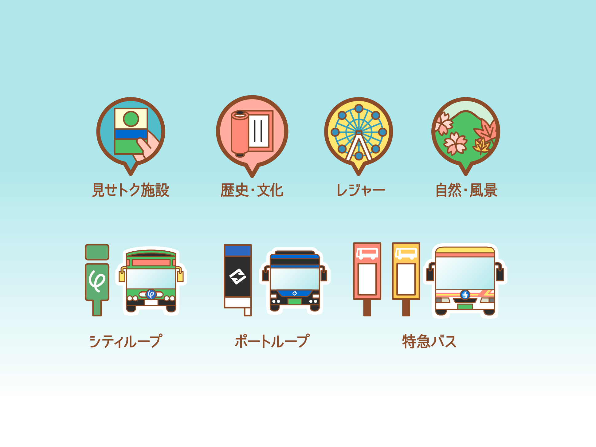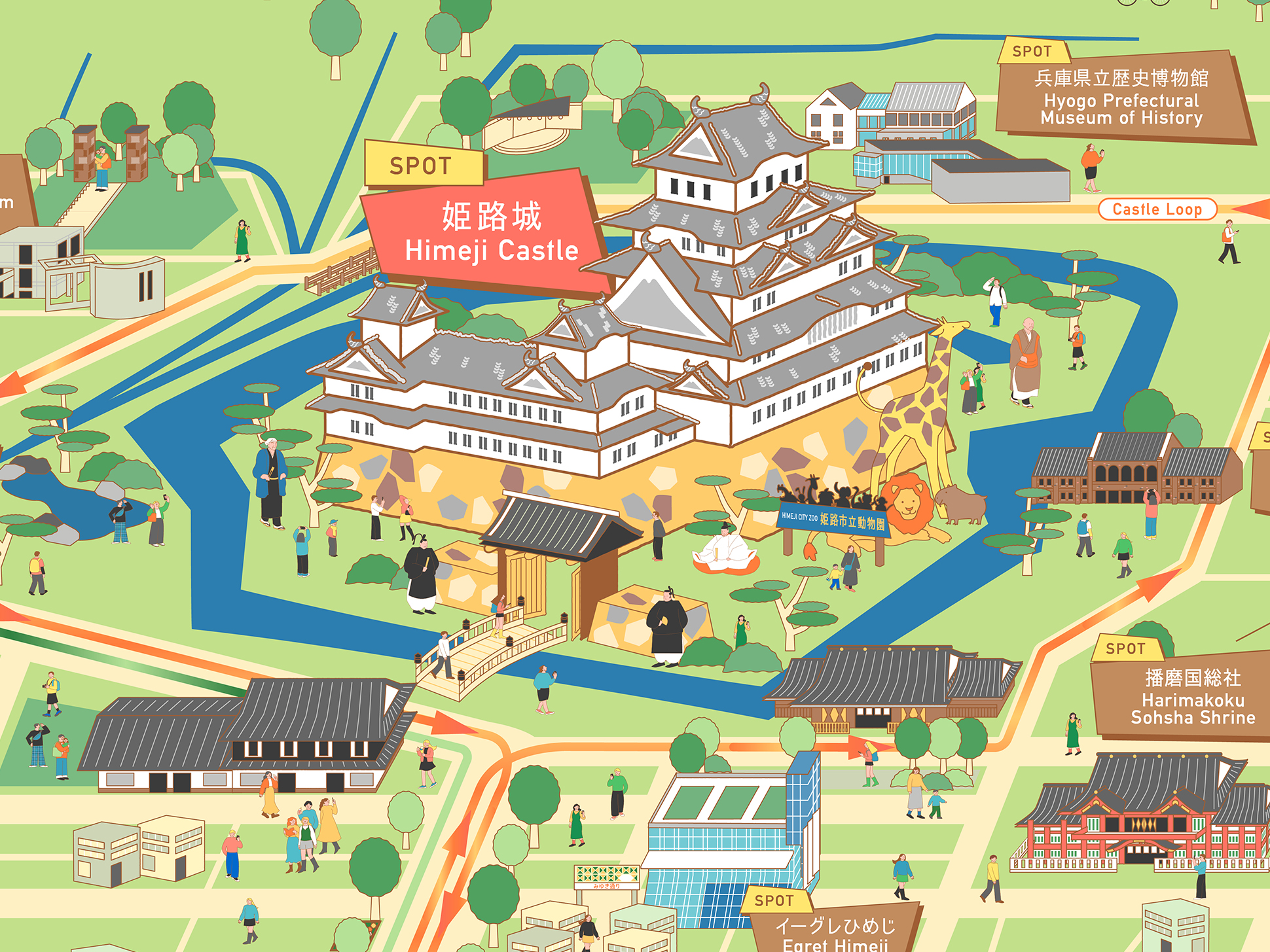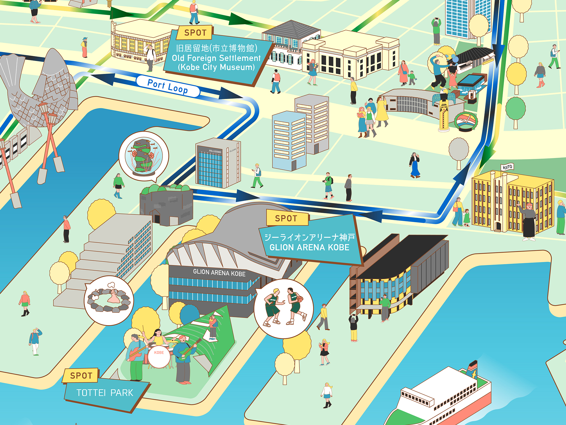 各スポットのモチーフをシンプルかつ象徴的に描き分けることで、視認性と楽しさを両立し、カラフルでありながらも落ち着きのあるトーンに仕上げています。