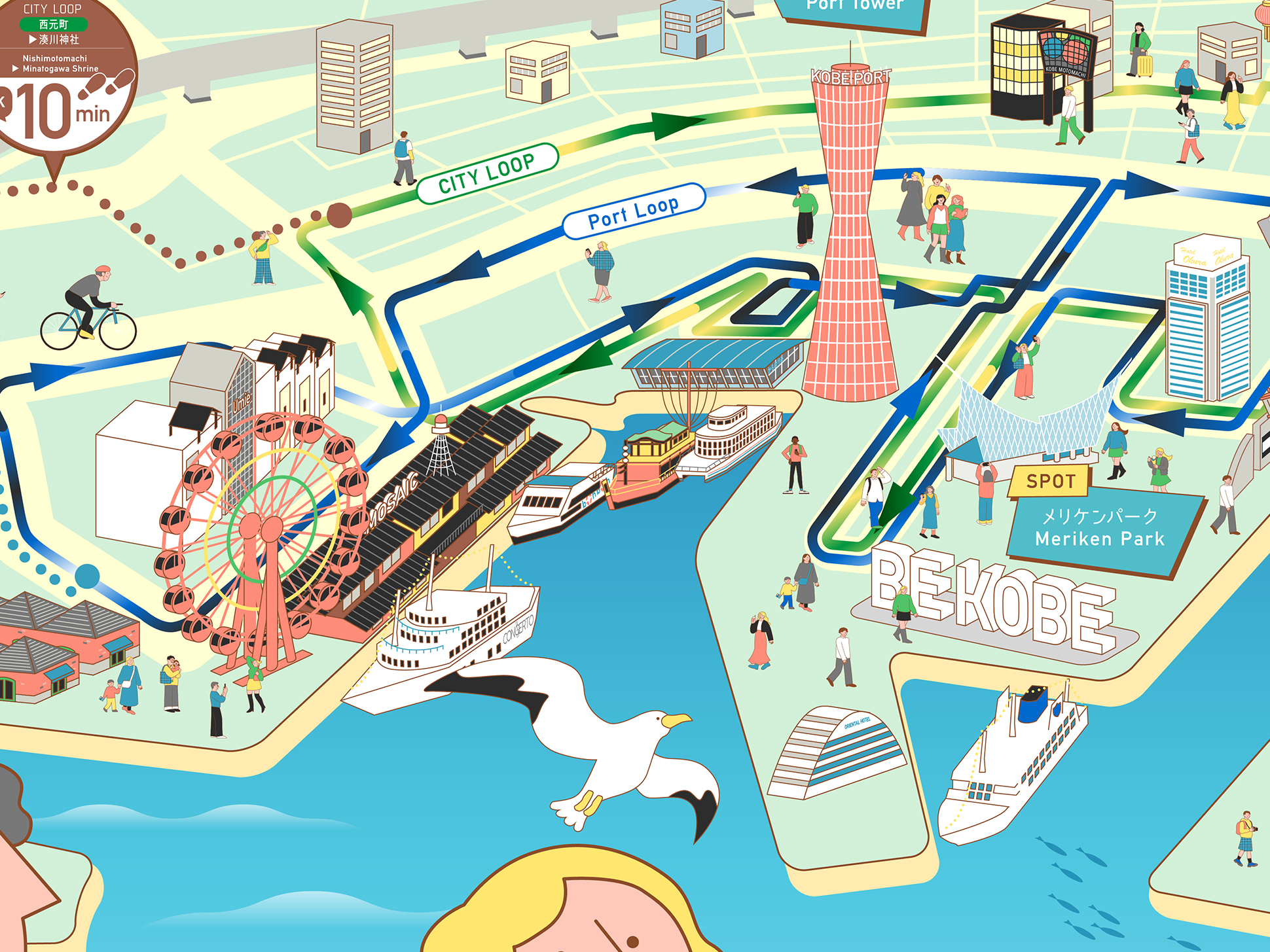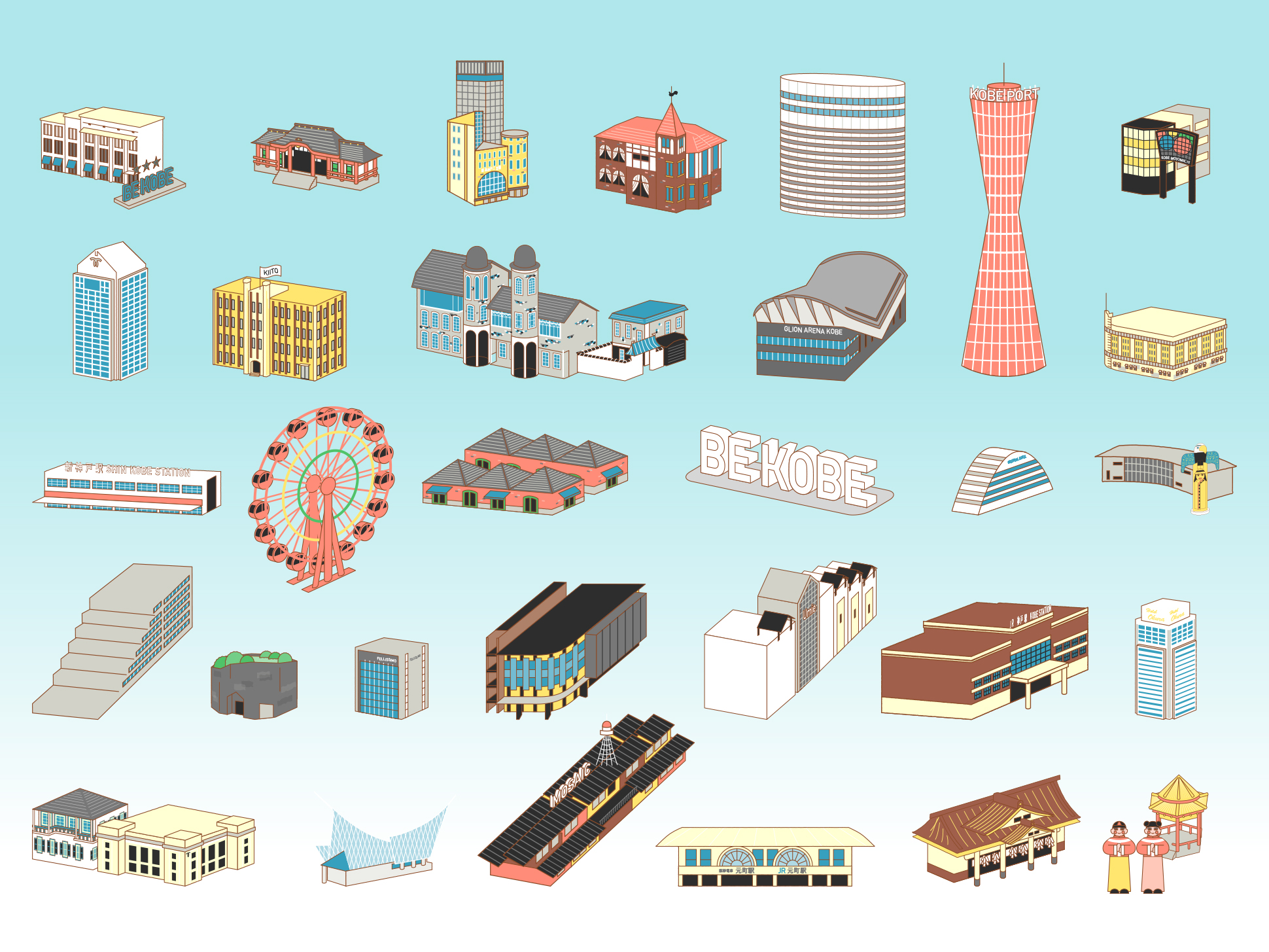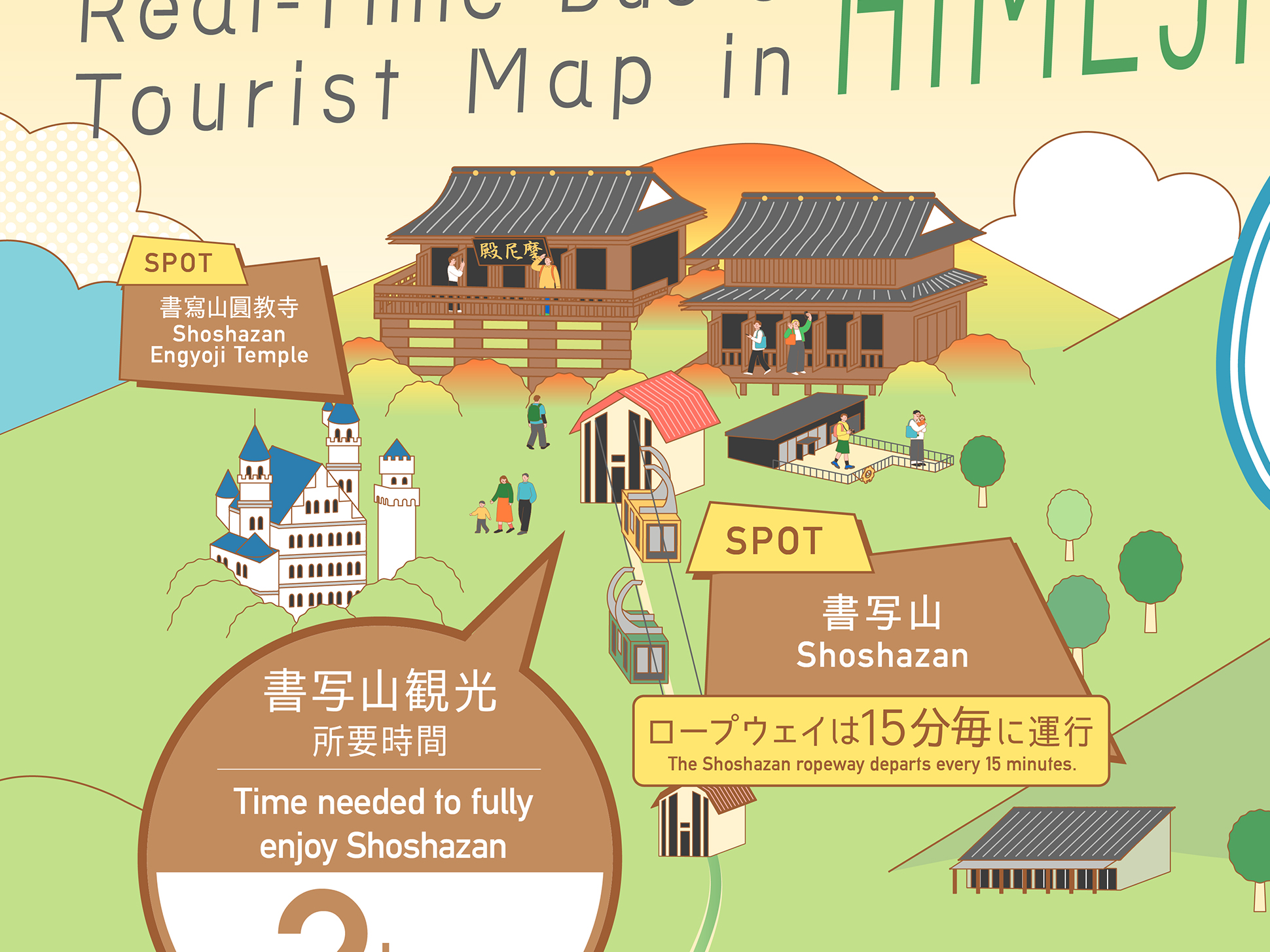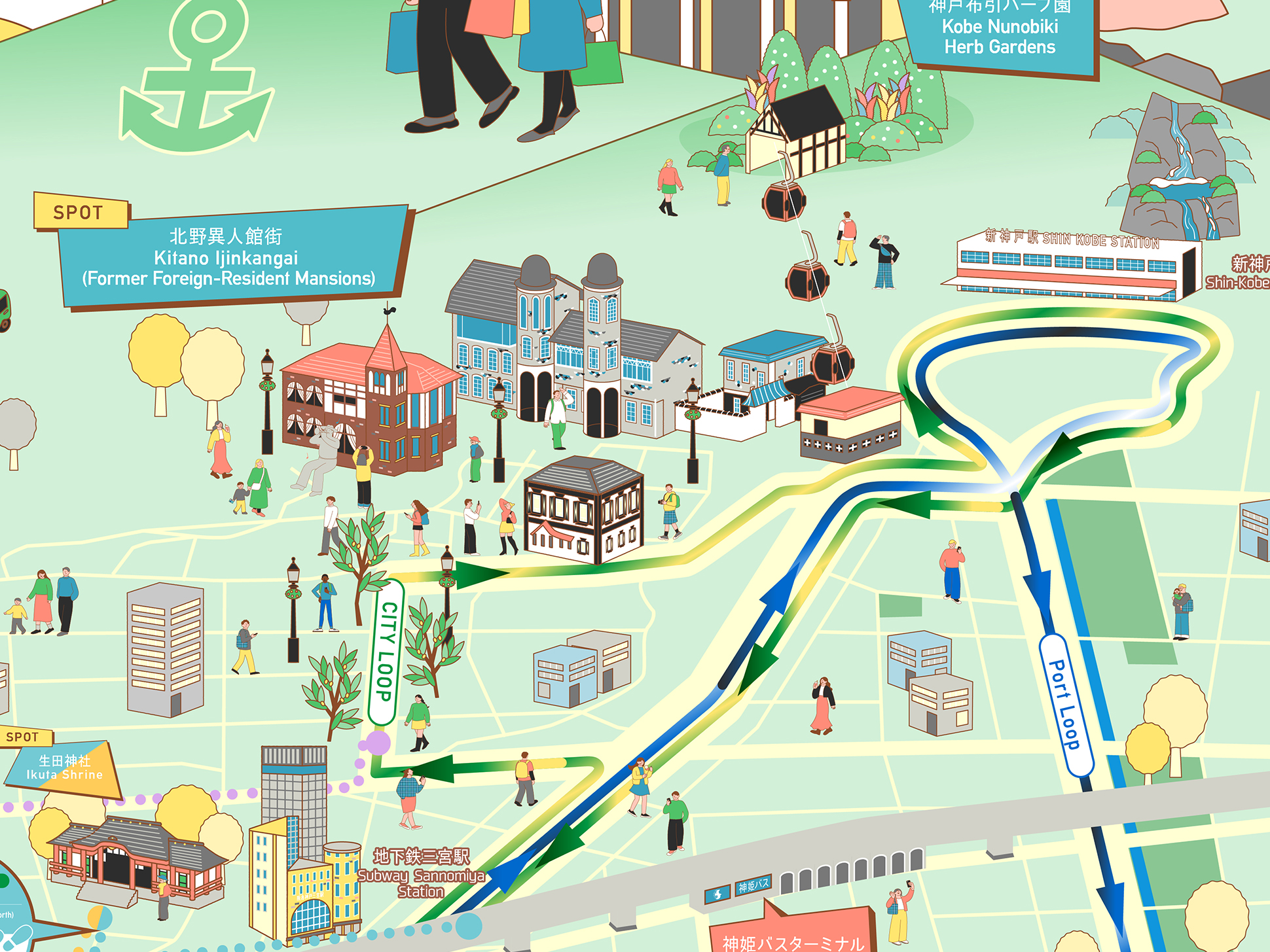 各スポットのモチーフをシンプルかつ象徴的に描き分けることで、視認性と楽しさを両立し、カラフルでありながらも落ち着きのあるトーンに仕上げています。