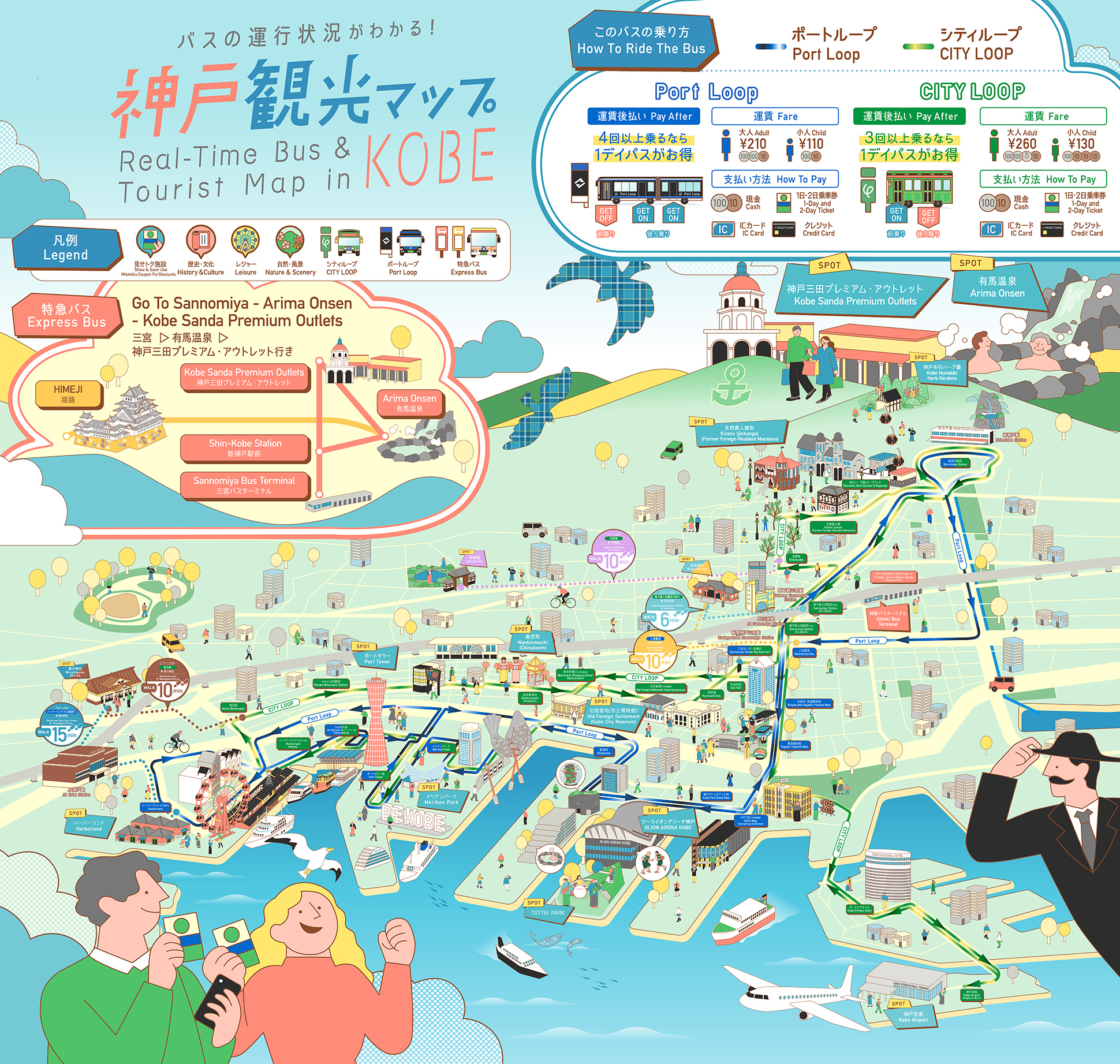 神戸ではポートタワーや南京町などの主要観光地、姫路では姫路城を中心としたエリアを軸に、モデルコースと連動しながら効率的な観光体験をサポートする設計となっています。