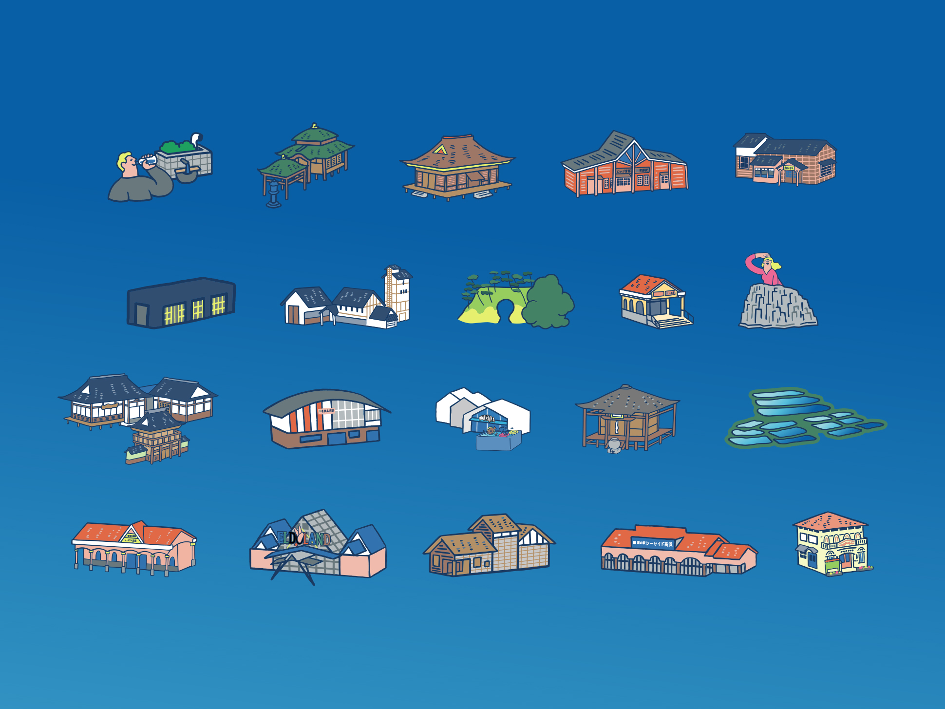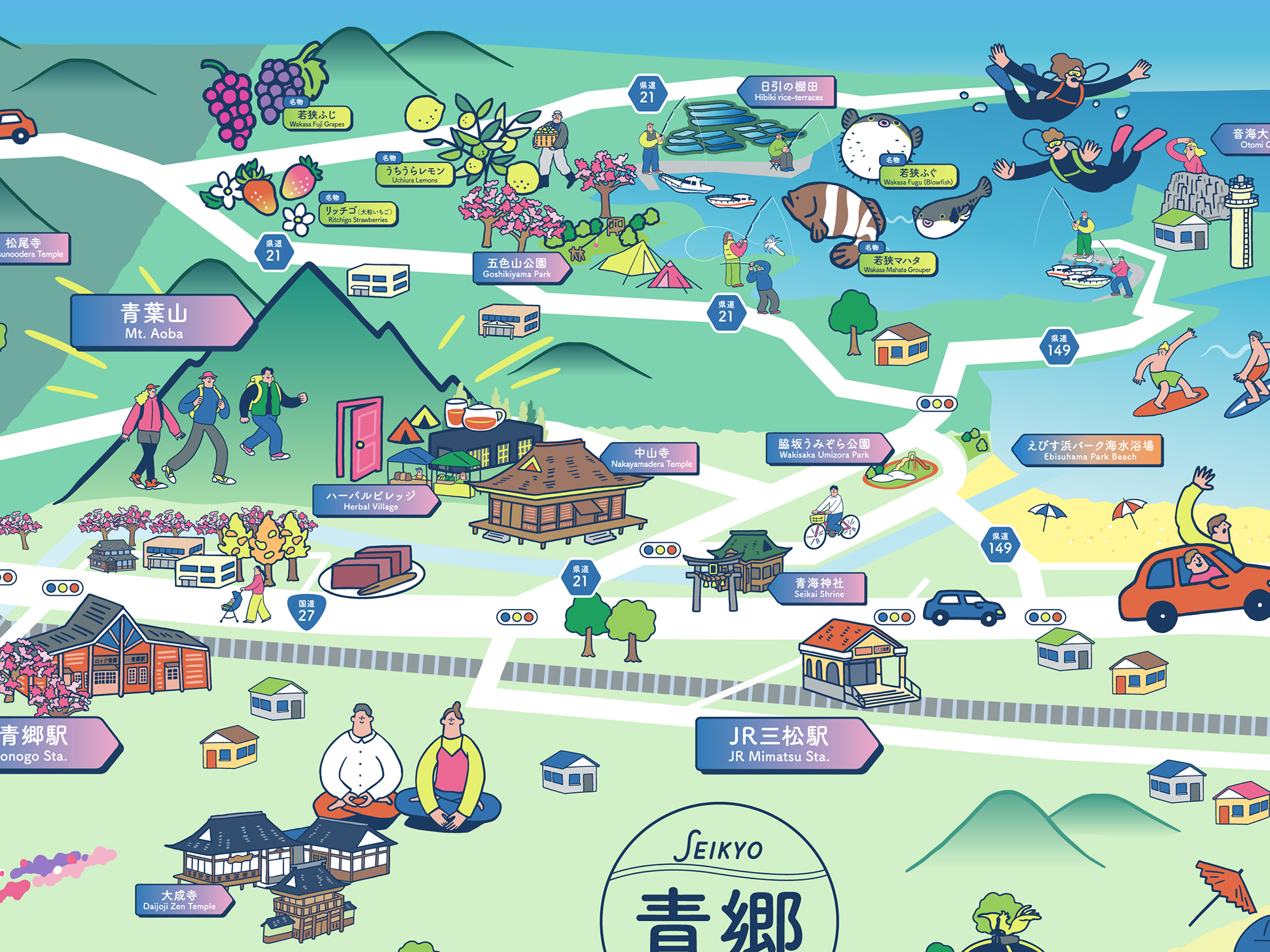 観光マップでありながら一枚の世界観として成立するビジュアルを目指しました。