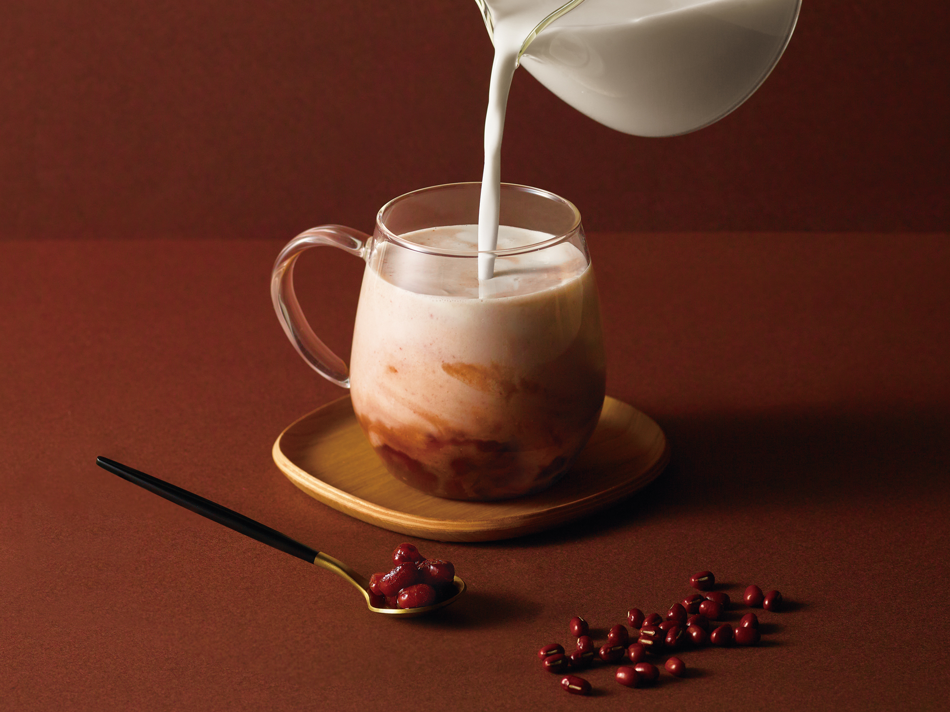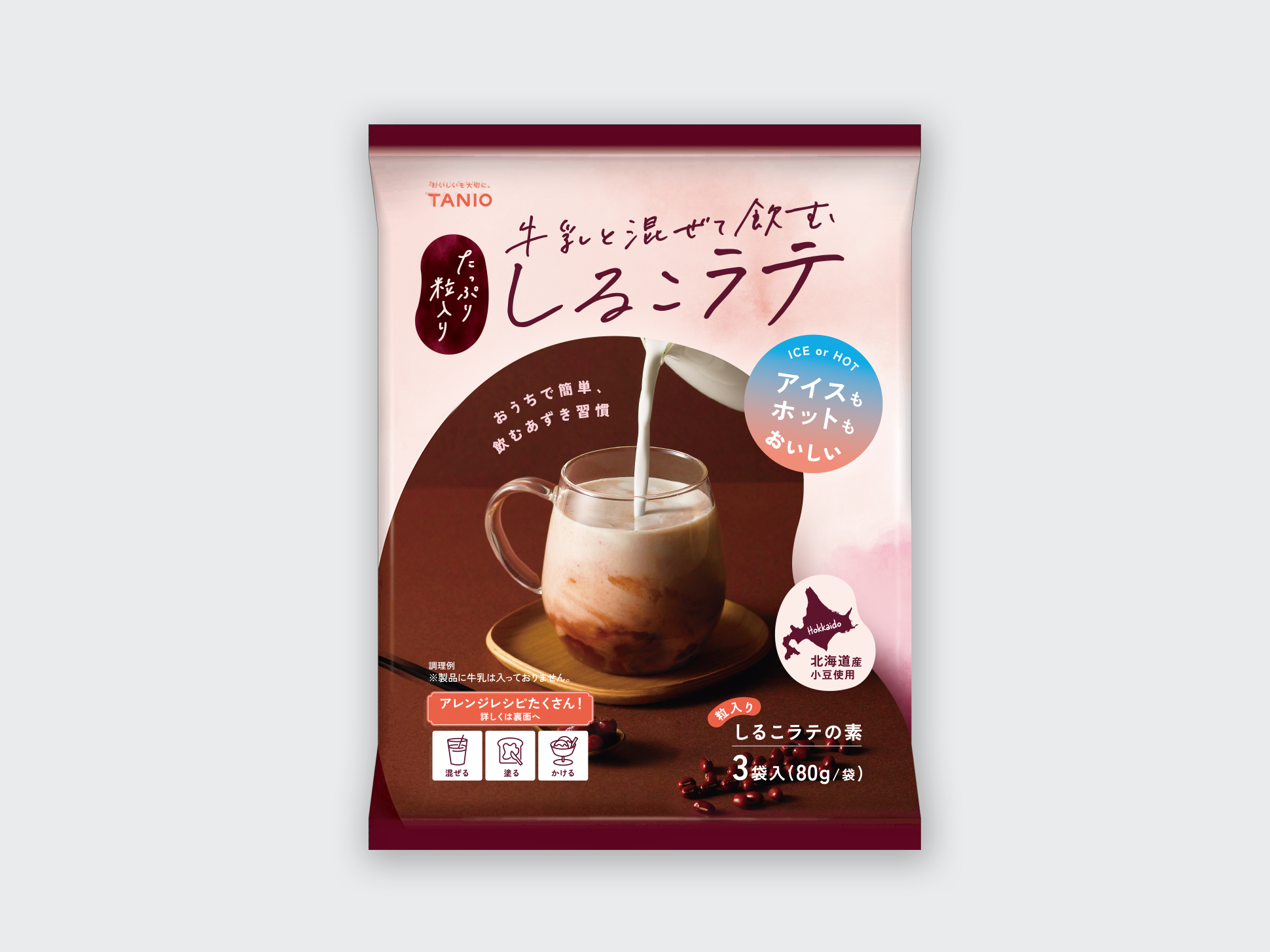 あずきが入ったカップにミルクを注いでいる画にすることで、しるこ=食べるというイメージを覆す、「飲める」しるこドリンクのシズル感を表現。アレンジレシピの画像も撮影し、パッケージ裏面やSNSでのプロモーションツールとして活用できるように制作しました。