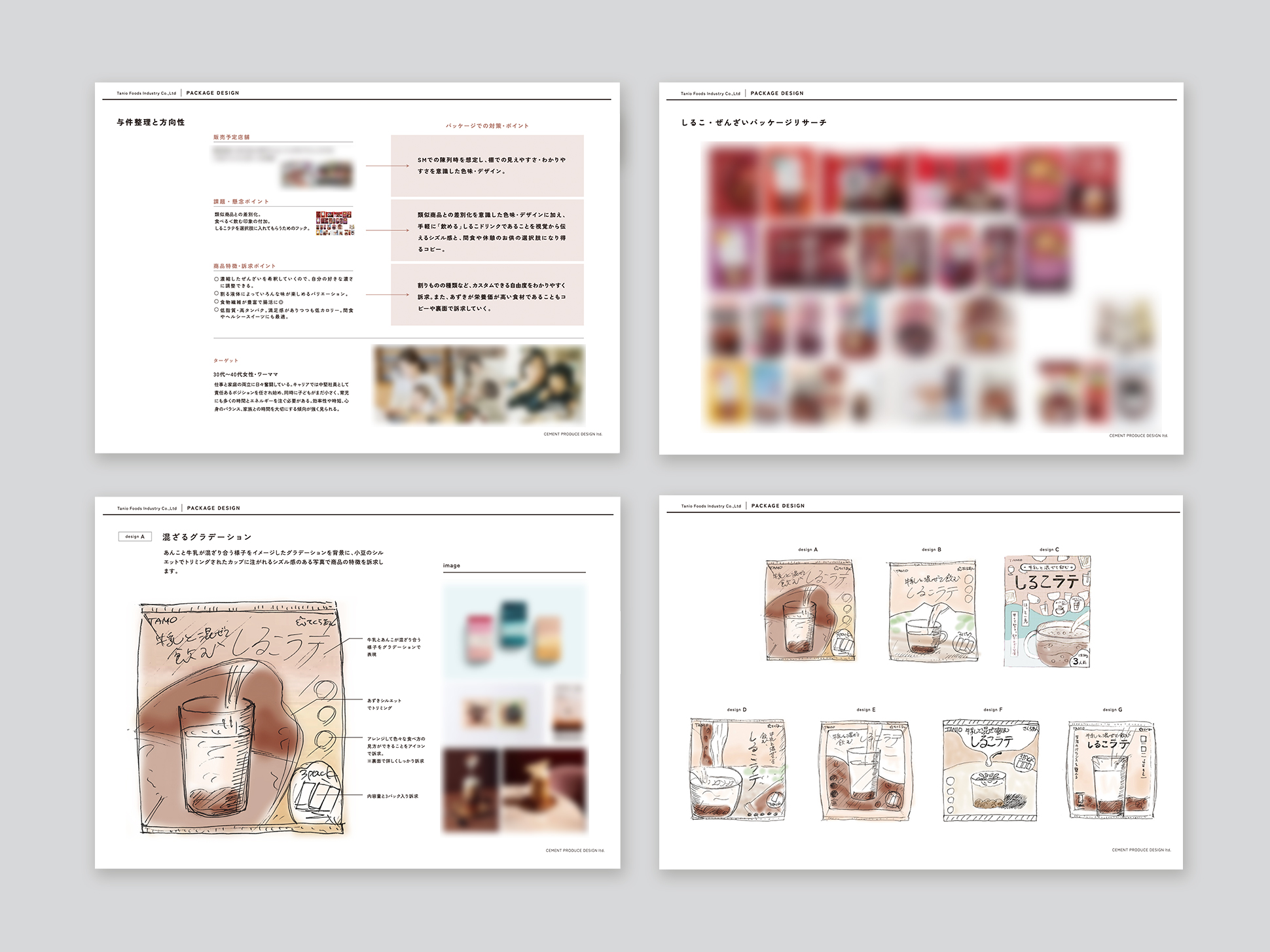 パッケージを制作するにあたり、まずはしるこ・ぜんざいのパッケージをリサーチ。類似商品との差別化を意識した色味・デザインを目指すとともに、手軽に「飲める」しるこドリンクであることを視覚から伝えるシズル感を入れ込む方向性に。また、小豆は食物繊維が豊富で腸活にもなり、低脂質で高タンパクで間食やヘルシースイーツにも最適なことから、ターゲット層を30~40代のワーキングマザーと設定。親子で一緒に作っておやつの時間を楽しんだり、間食や休憩のお供の選択肢になり得るコピーを開発する方針を固めました。