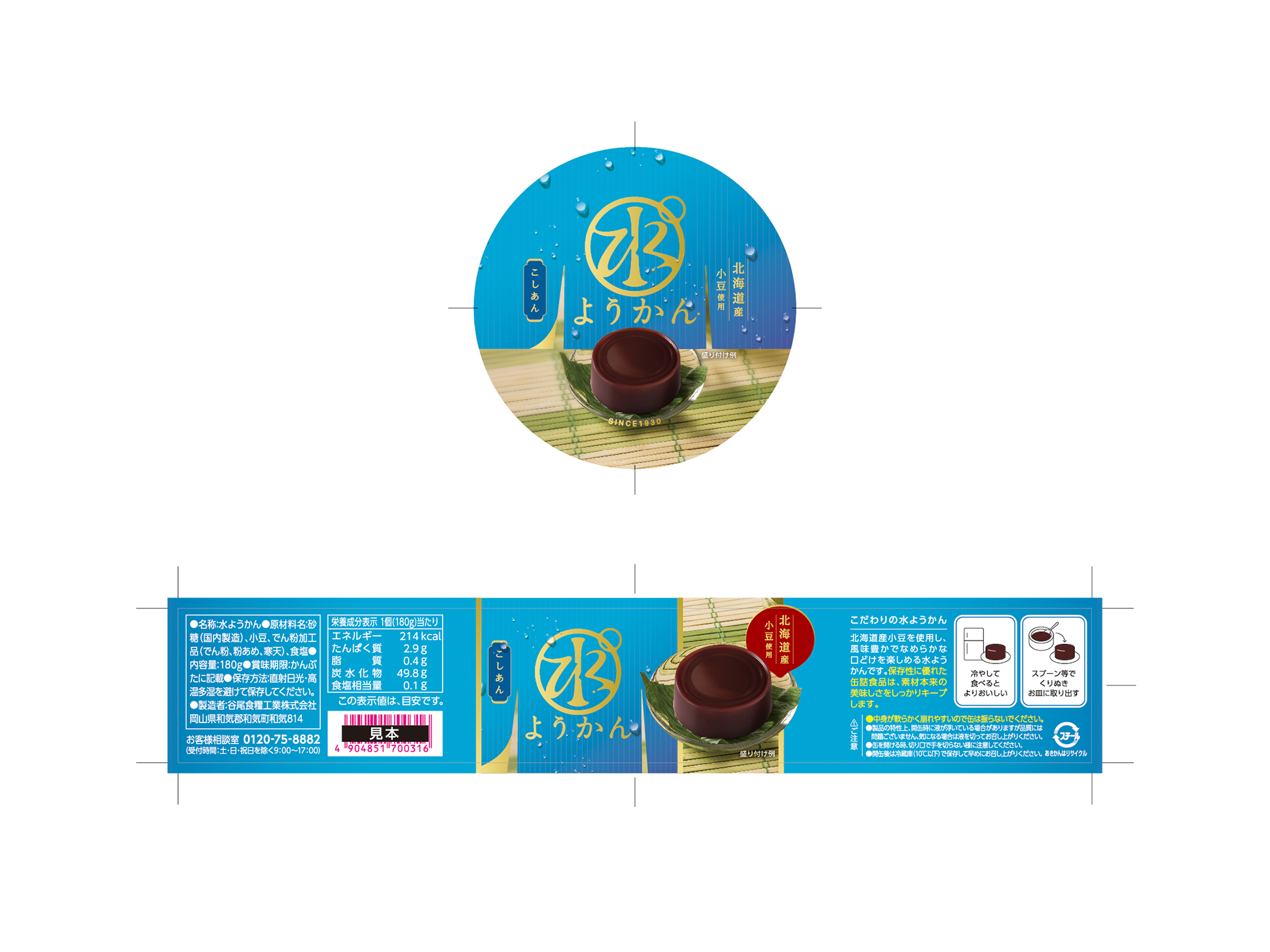 どんな高さの棚に陳列されても認識してもらえるように、水ようかんの写真を天面と側面に配置し、水ようかんのみずみずしい食感を想起させるように水滴のデザインをあしらいました。また、「1930年創業のあんこ屋がつくる極上の水ようかん」というキーワードから、老舗・信頼感のある訴求とデザイントーンも意識して制作。老舗感が伝わる「のれん」のモチーフと、マットなゴールドで上質感をプラスしています。