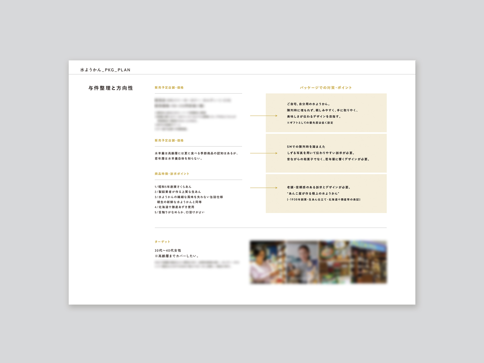 スーパーマーケット等での販売を目的とした水ようかんのパッケージデザイン。昨今の和菓子ブームもあり、コンビニエンスストアでも夏場にカップの水ようかんが販売されているところもありますが、まだまだ若年層の水ようかんの認知は乏しいのが現状です。そのため、シズル感のある写真を用いて、スーパーマーケットに陳列された際にも伝わりやすく、若年層にも響くデザインへ方向性を固めました。