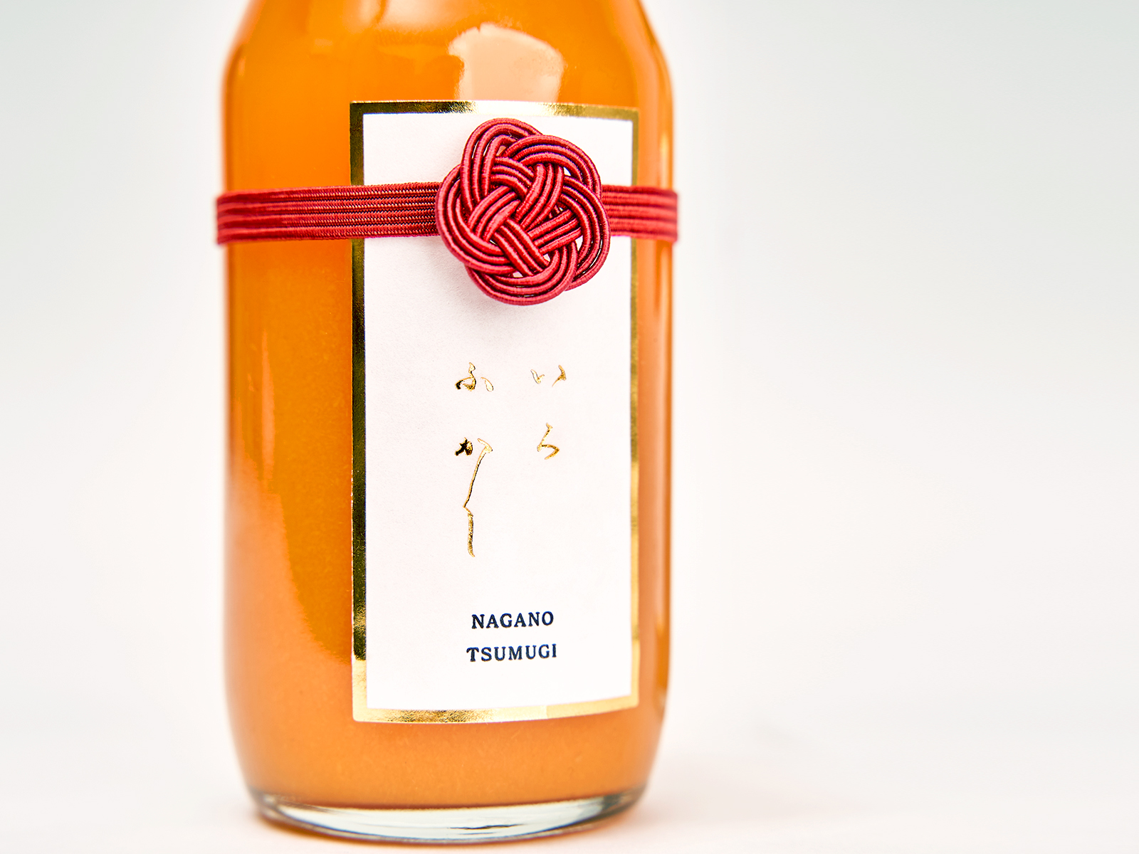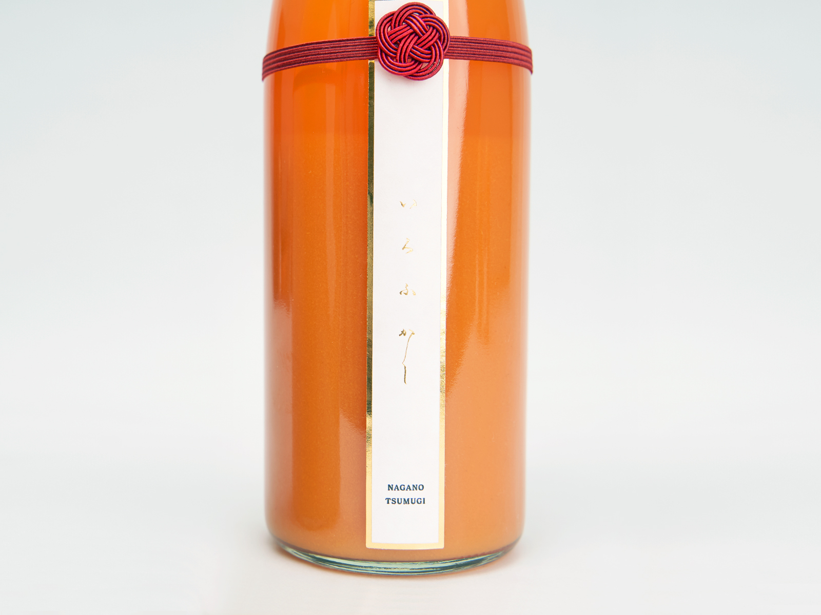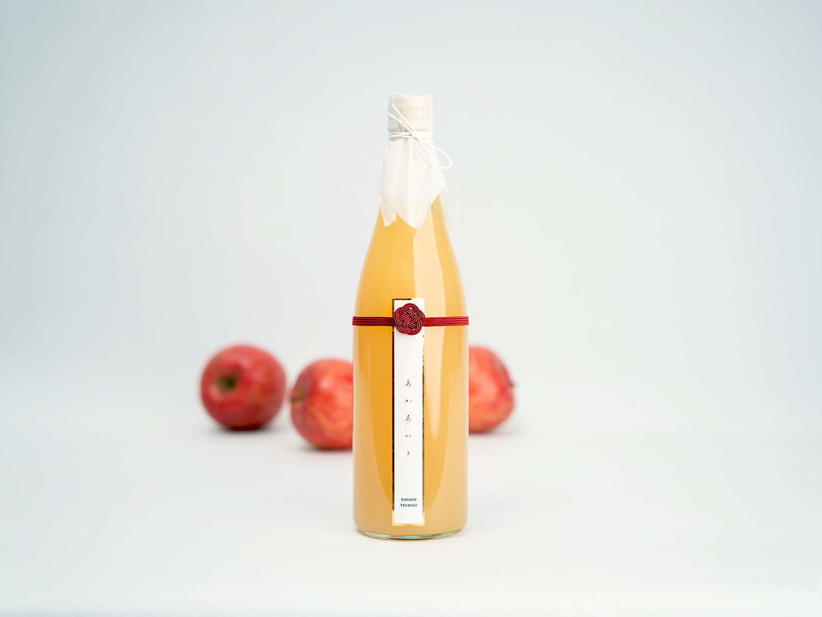 ラベル上部には、紡ぎさまのロゴモチーフでもある“りんごの花”をイメージした水引を採用。