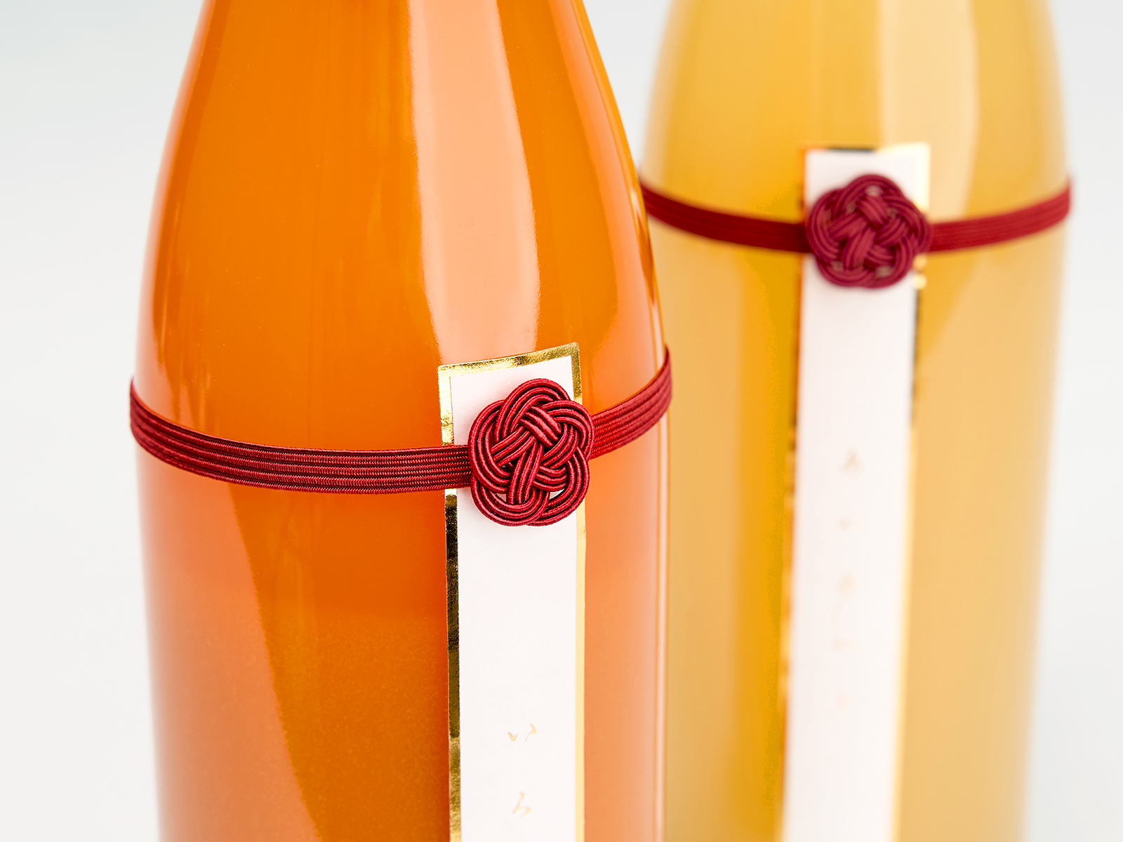 本商品は、「水引+熨斗」をモチーフに構成したパッケージデザインです。紡ぎさまが大切にされている“ご縁を紡ぐ”という思想を軸に、りんごジュースを単なる飲料ではなく、人と人をつなぐ存在として再定義しました。ラベルは熨斗を想起させる縦構成とし、中央に筆文字で商品名「あかあかと」「いろふかし」を配置。装飾を削ぎ落とし、真摯に向き合う佇まいをつくることで、日本料理店ならではの静かな品格を表現しています。横断する水引は“結び”と“縁起”の象徴。