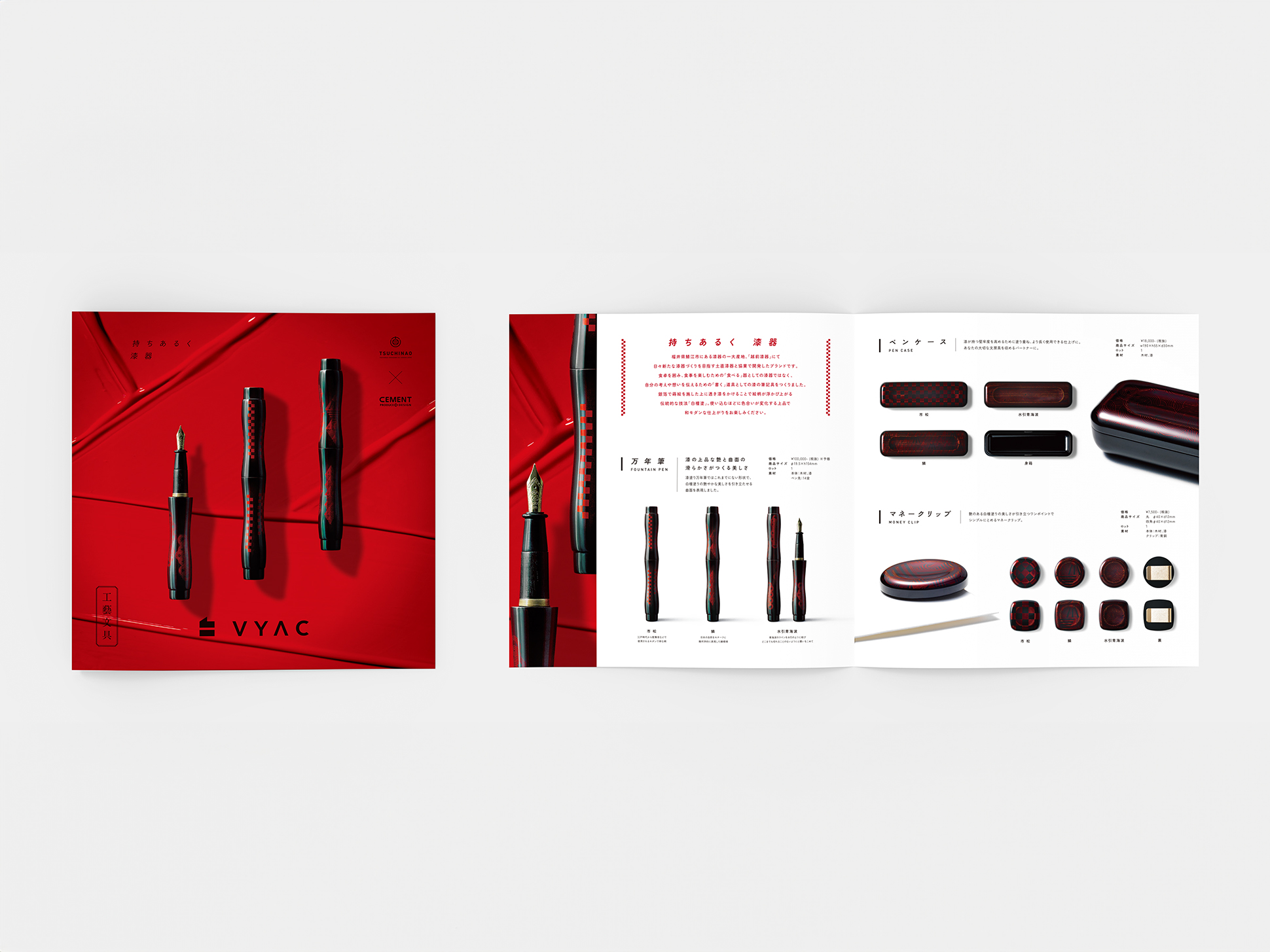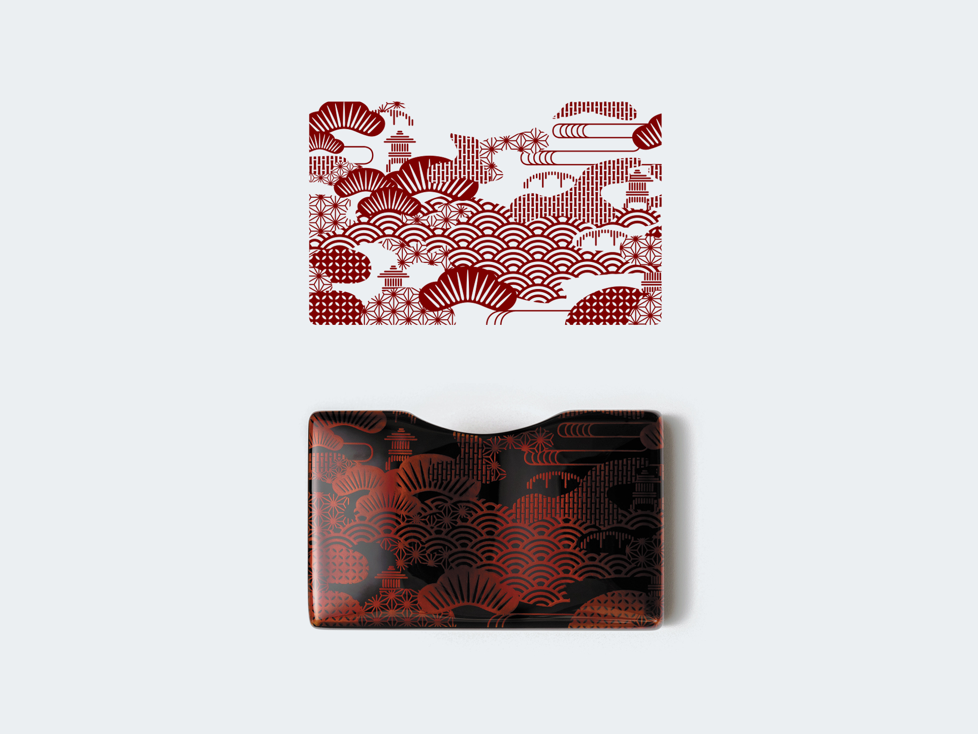 漆を想起させる深みのある赤で、越前漆器らしい存在感と日本らしさをモダンに表現しました。表面には黒の箔押しでロゴを配置し、越前漆器や白檀塗の説明をグラフィカルにレイアウト。