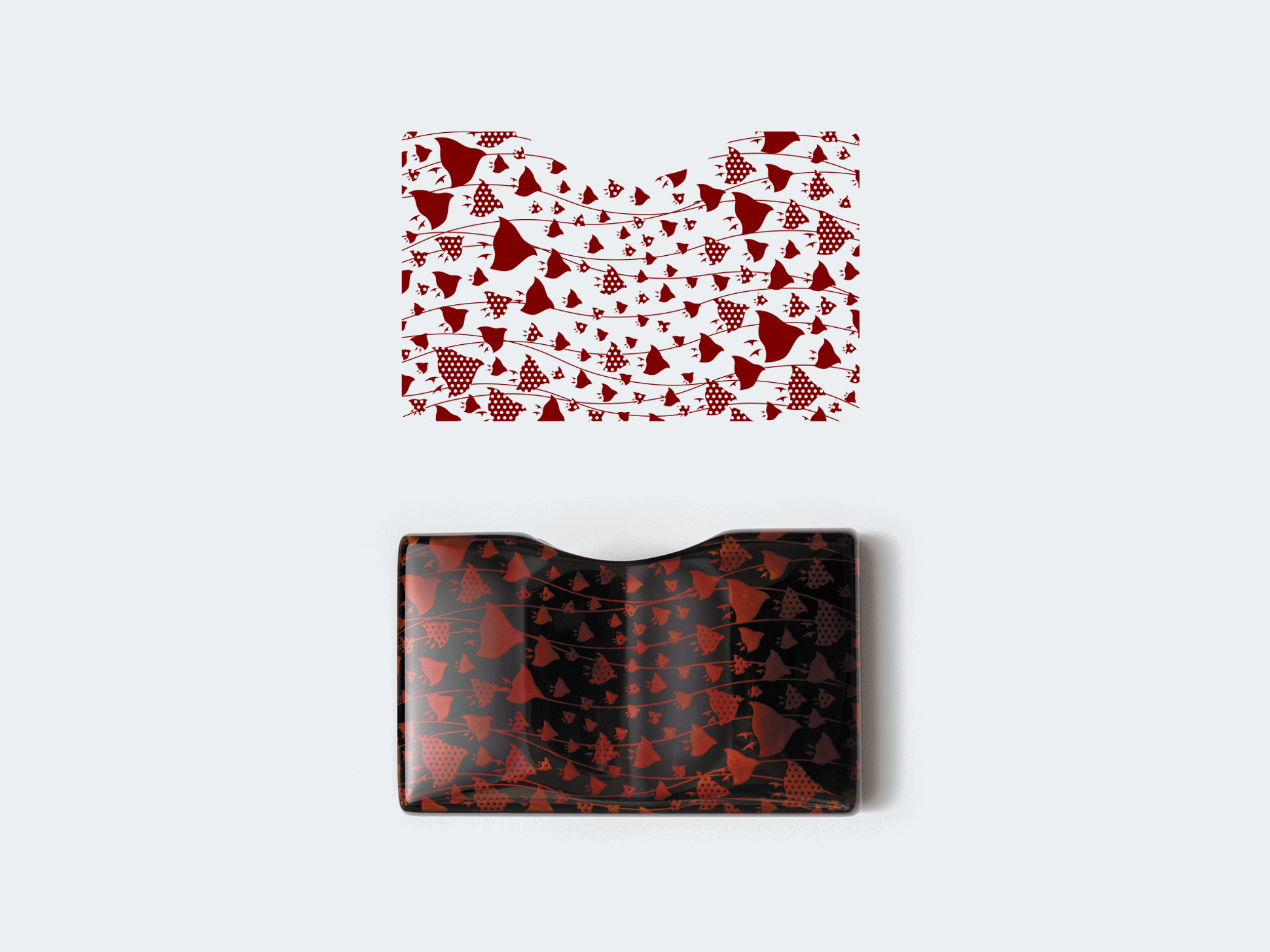 シルエットとスケッチ風の葉を組み合わせ、つながりやご縁を象徴する蕾を織り込んでいます。名刺ケースという“人と人をつなぐ道具”に込めた意味を、模様そのものに内包させました。
