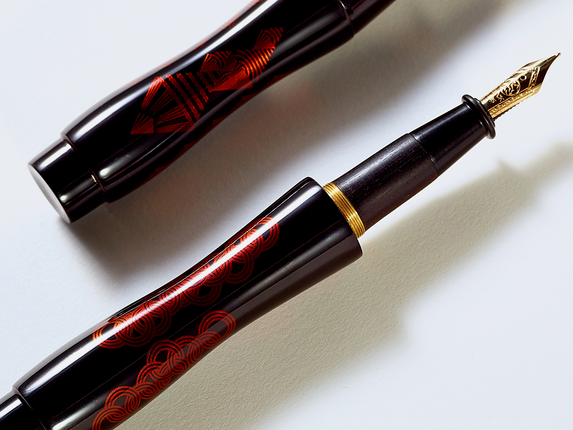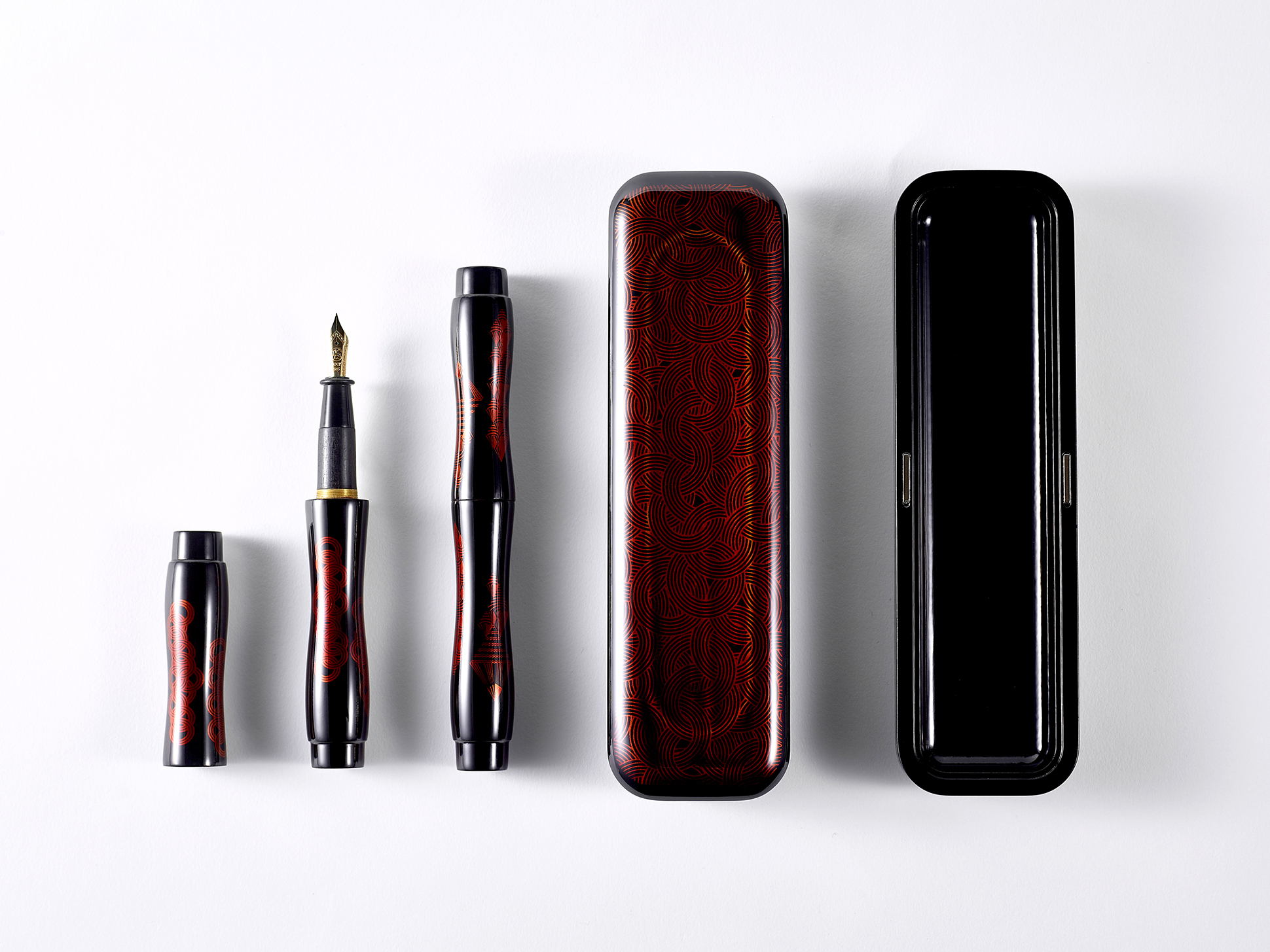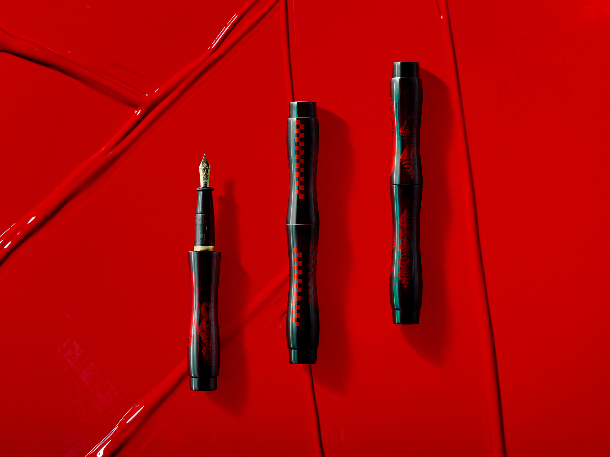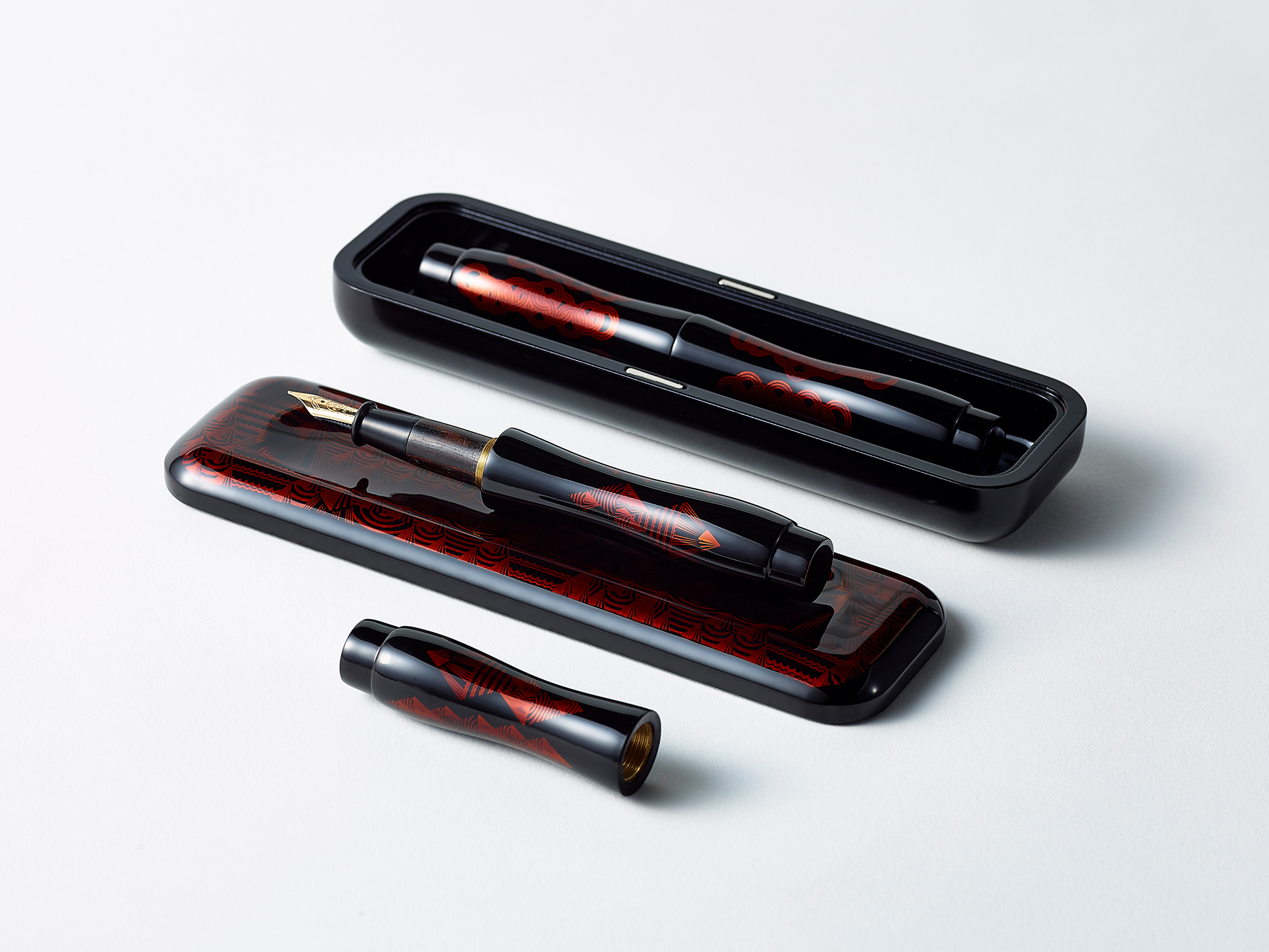 漆の象徴的な赤を背景に、万年筆の存在感あるフォルムを強調。