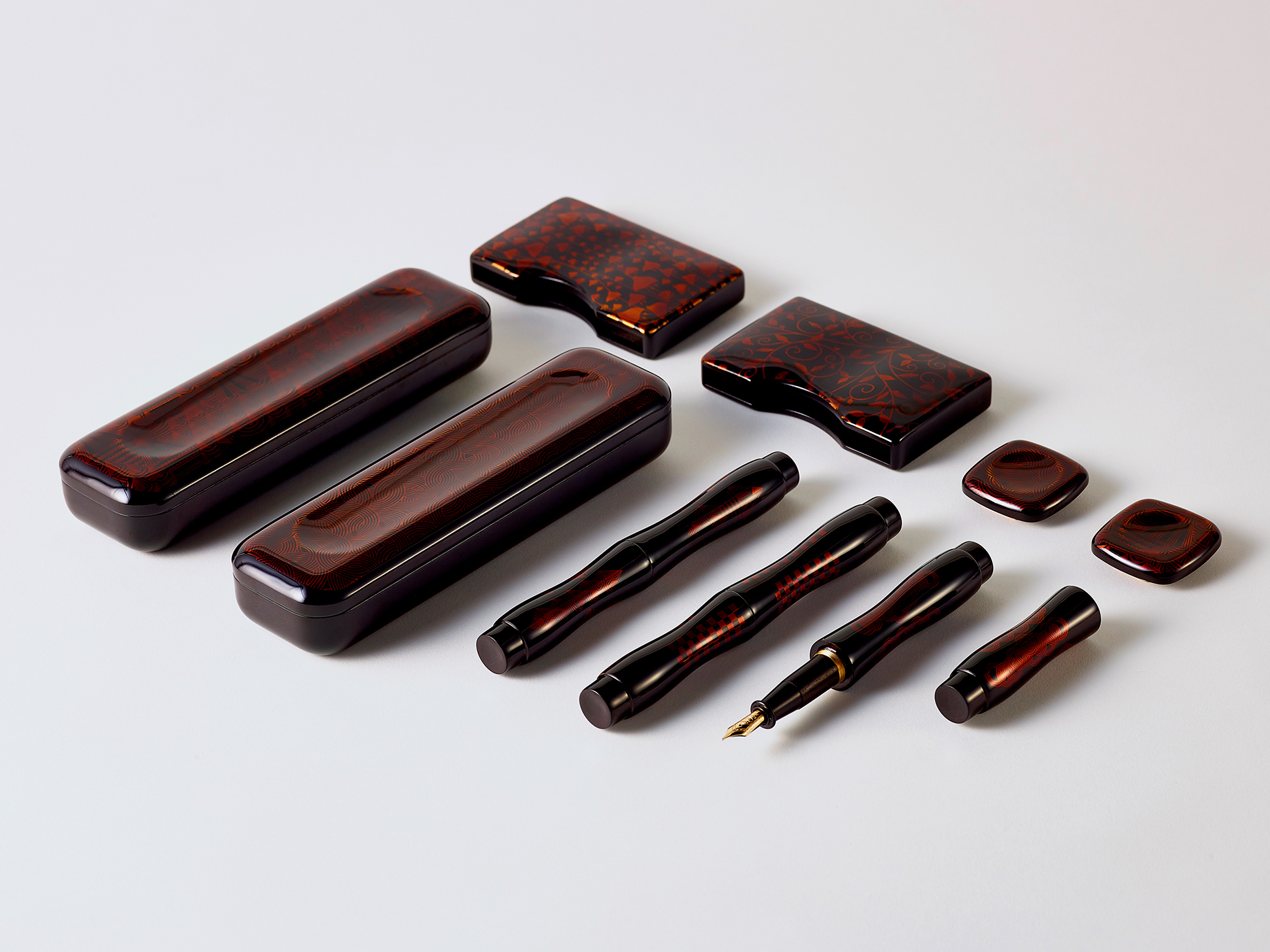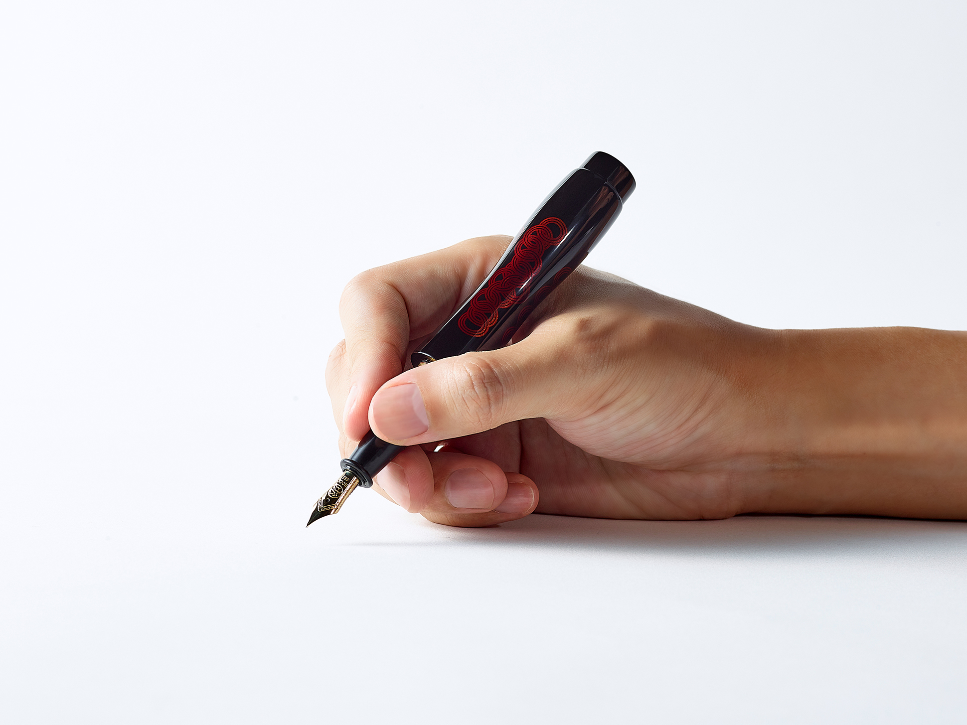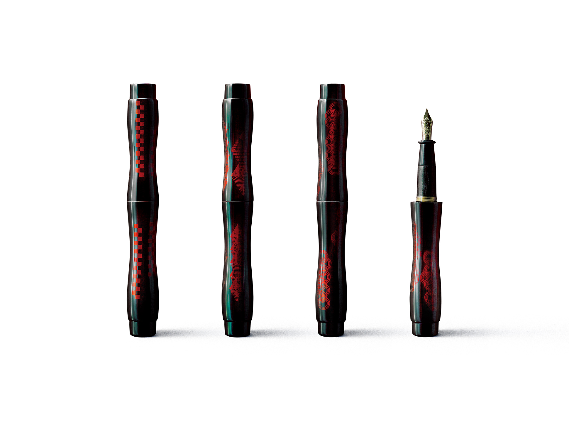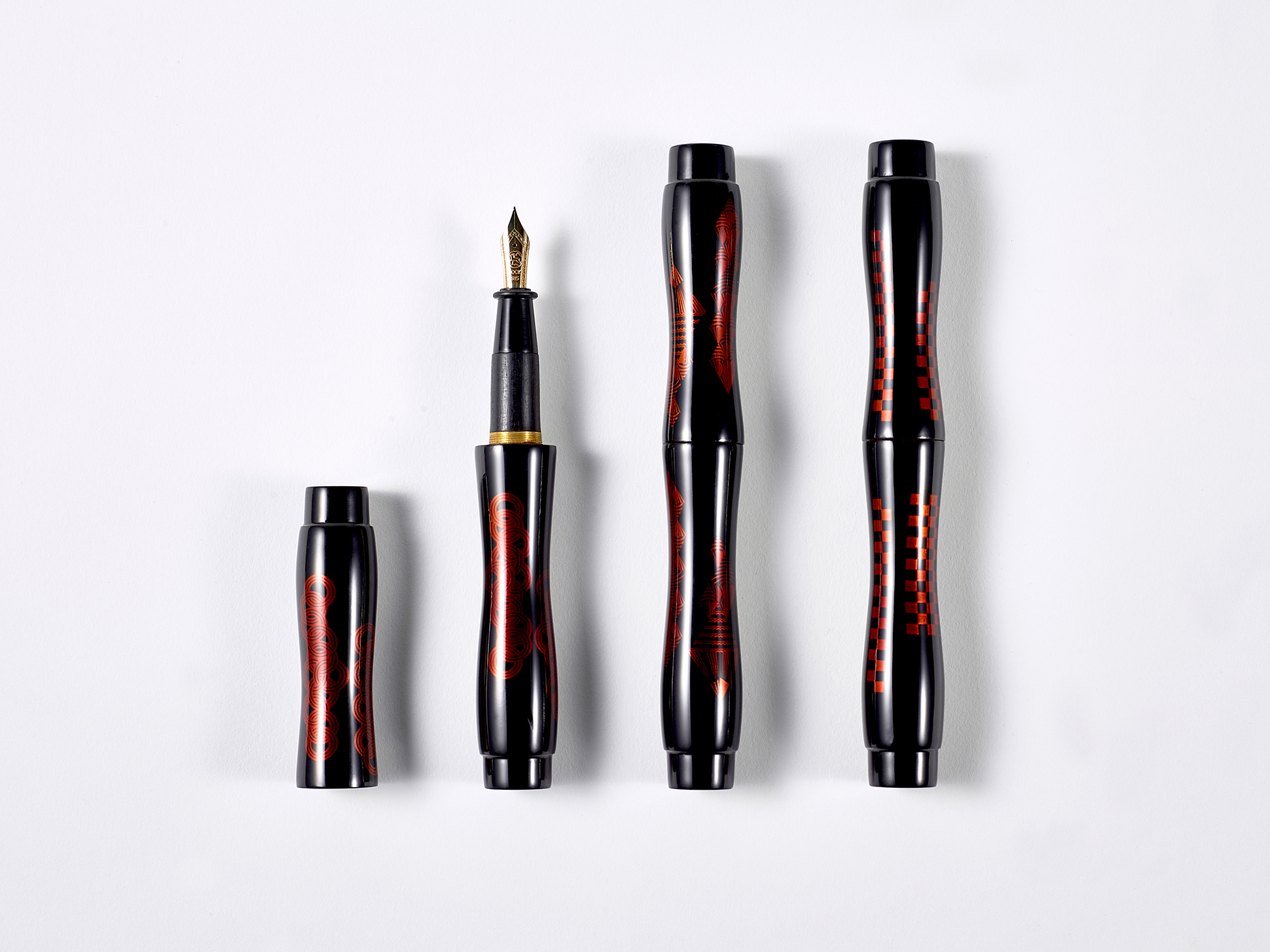 漆の象徴的な赤を背景に、万年筆の存在感あるフォルムを強調。