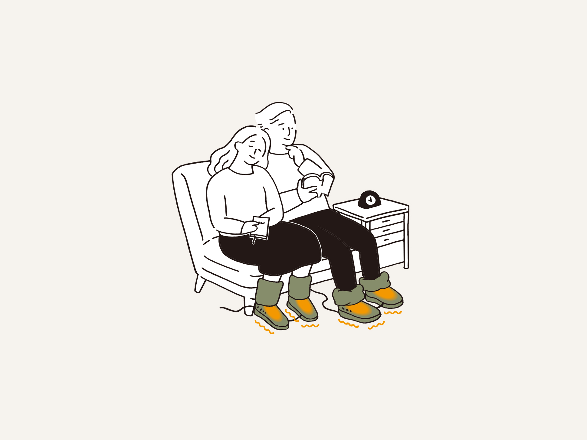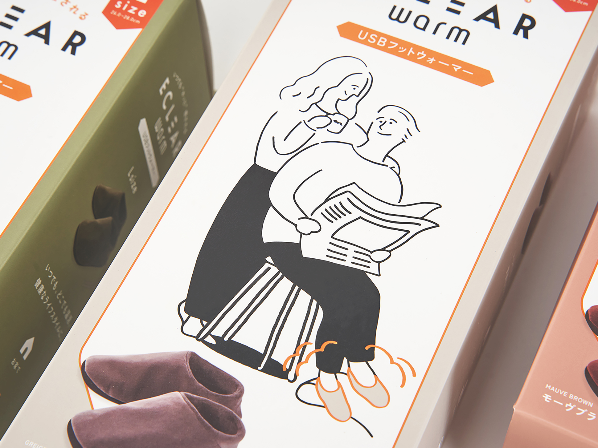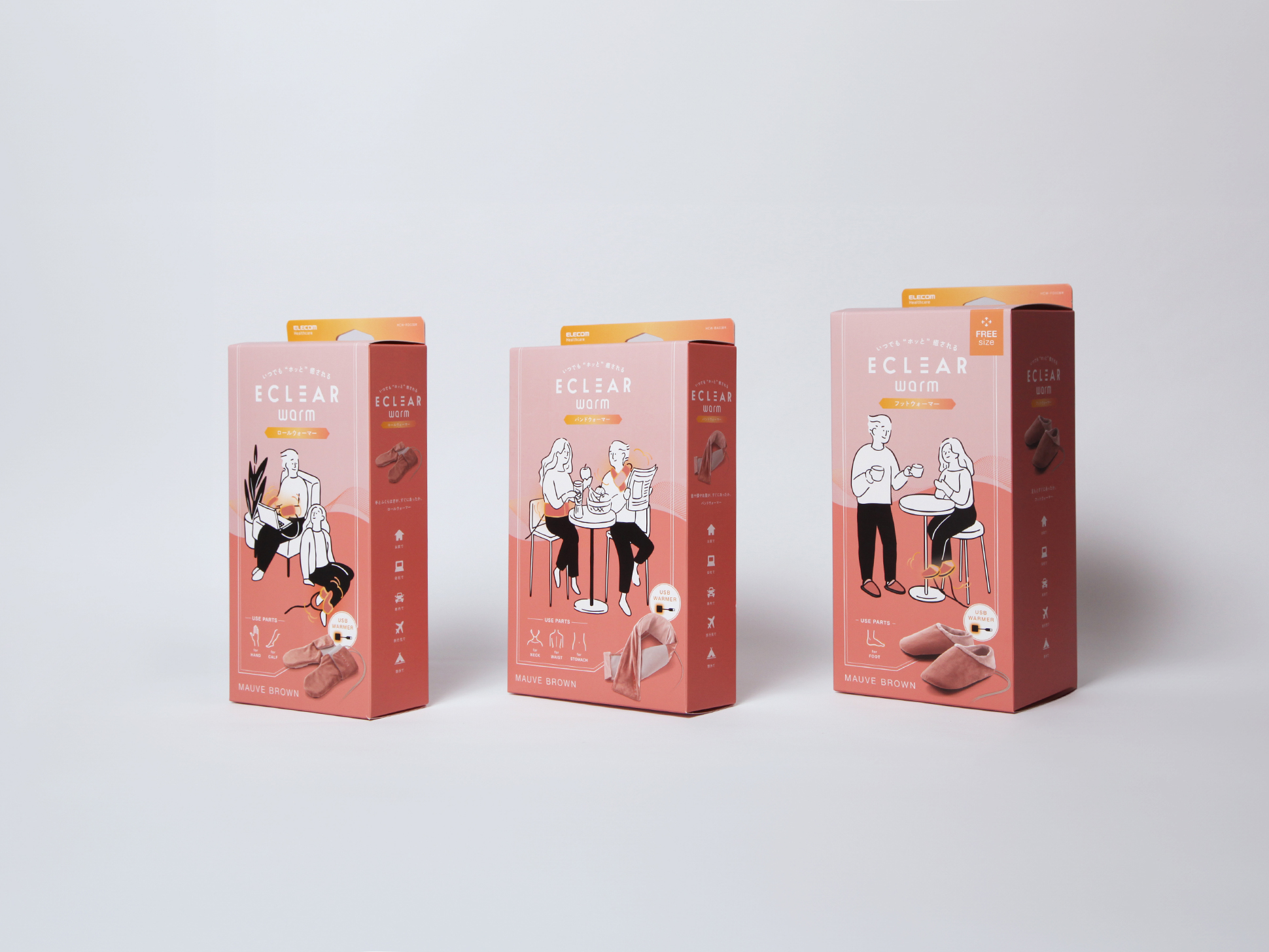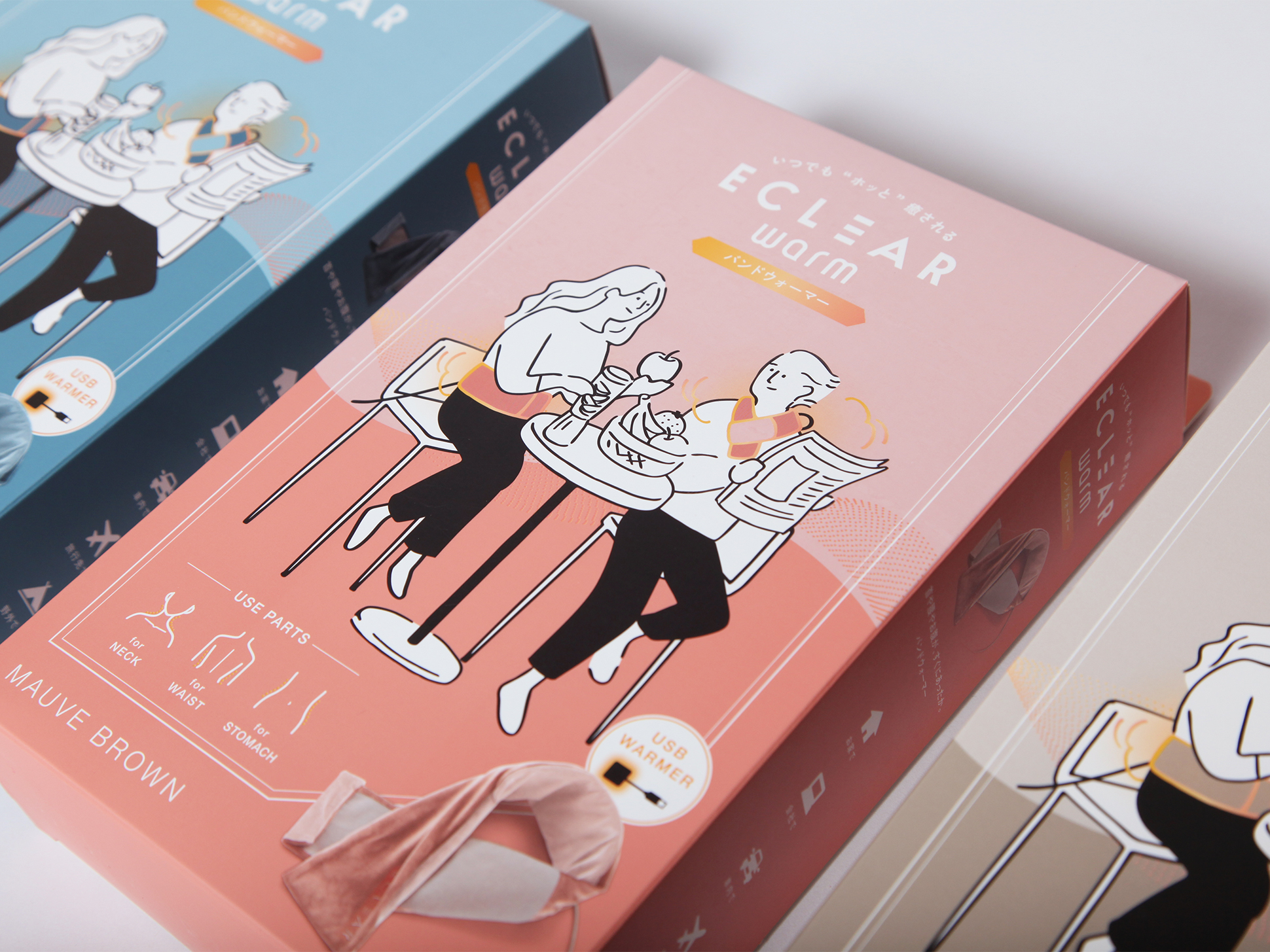 ECLEAR warmシリーズのパッケージでは、温活アイテムが日常の暮らしの中で自然に使われる様子をイラストで表現しています。