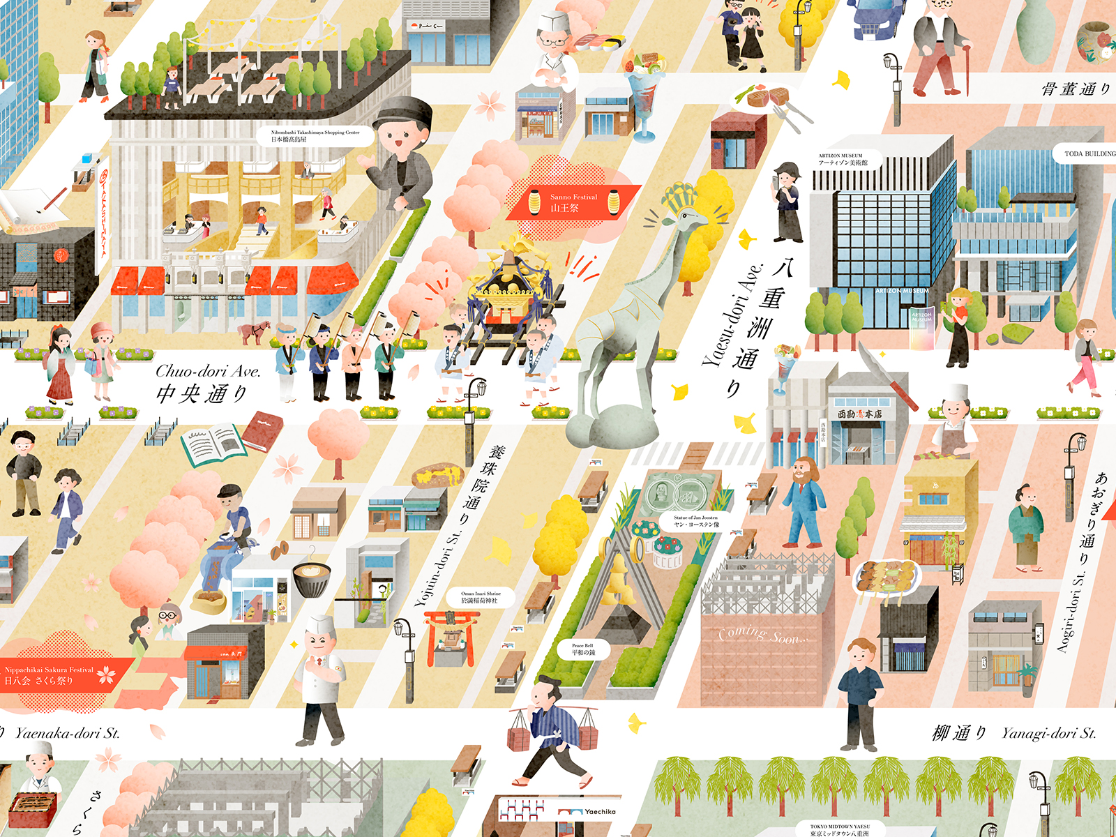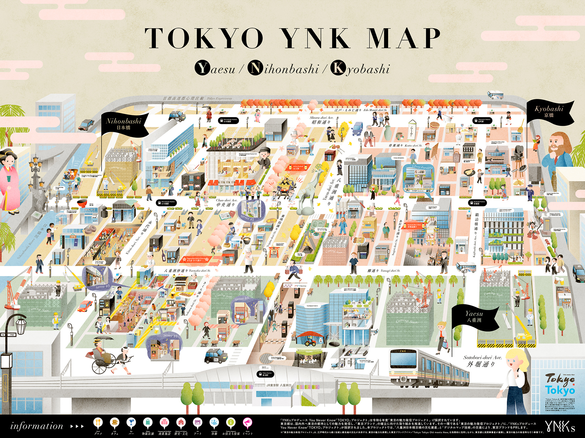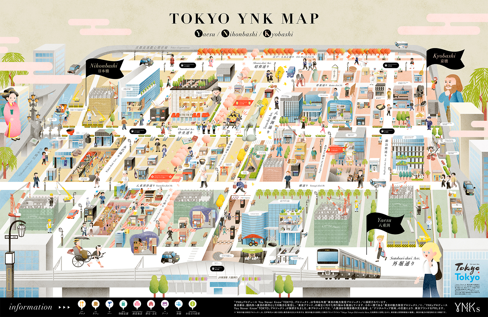 東京建物株式会社さまが推進する『YNKsプロデュース You Never Know「TOKYO」プロジェクト』の一環として、株式会社Strolyさまよりご依頼を受け、YNK(八重洲・日本橋・京橋)エリアのデジタルイラストマップのアートディレクション・デザインを担当しました。