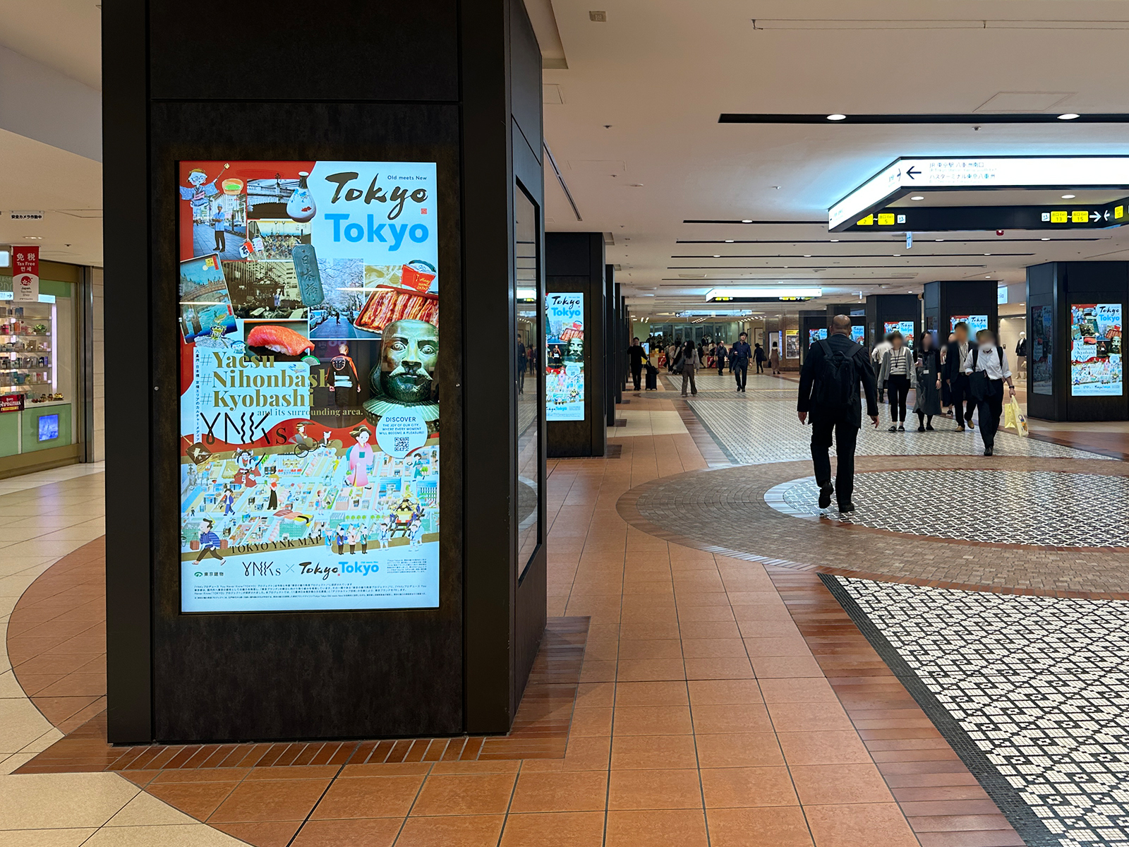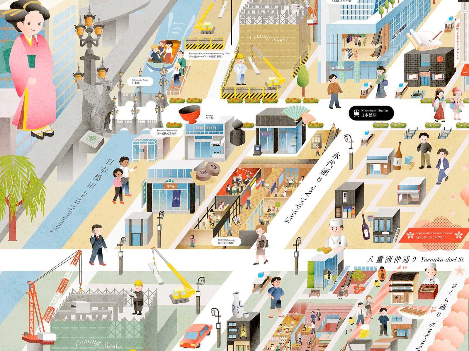 八重洲・日本橋・京橋は、江戸期から商いと文化の中心として栄えてきた歴史ある街です。現代の人々と過去の人々を同じ画面内に共存させることで、YNKエリアが時間を重ねてきた都市であることを、視覚的に表現しています。